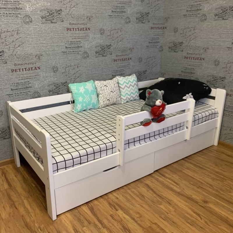 Спальное место: 90х200 см. Материал: массив сосны. В комплекте: выдвижной ящик 2шт., бортик.