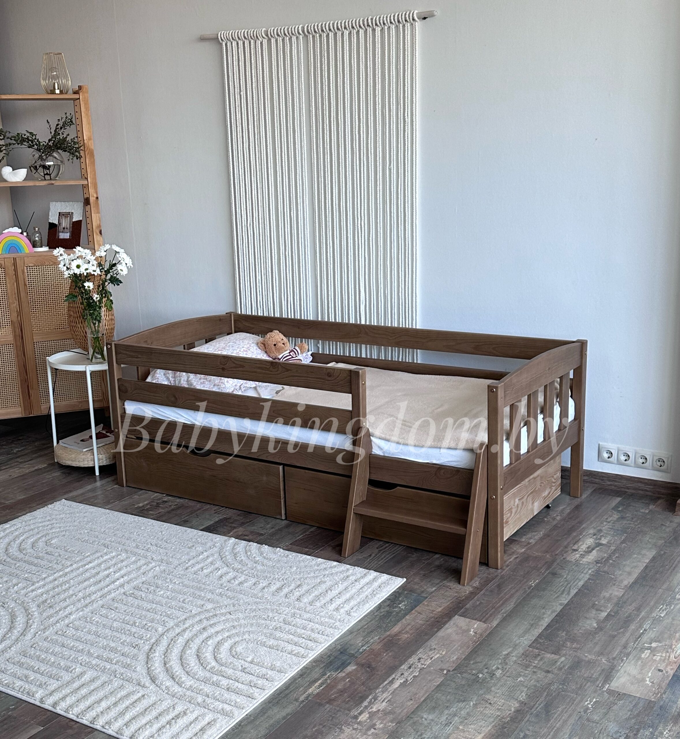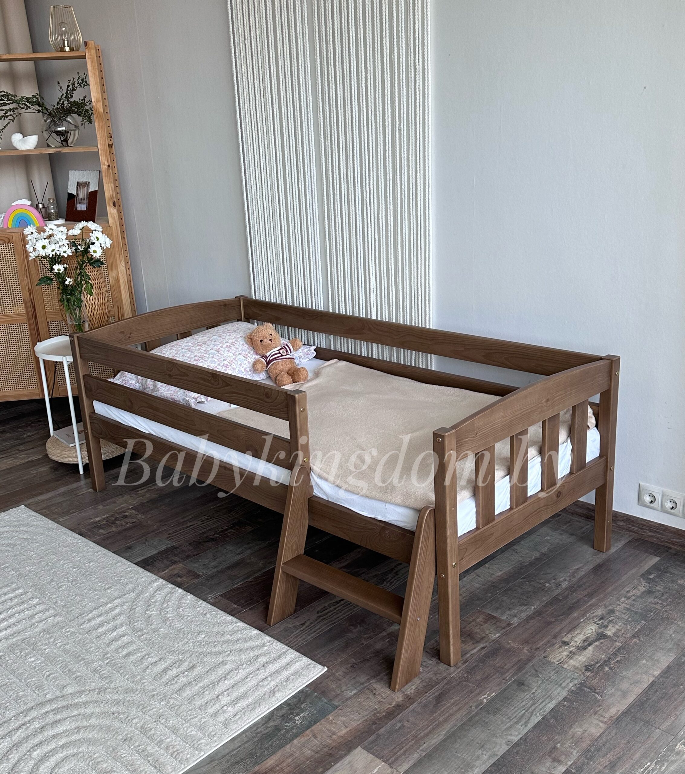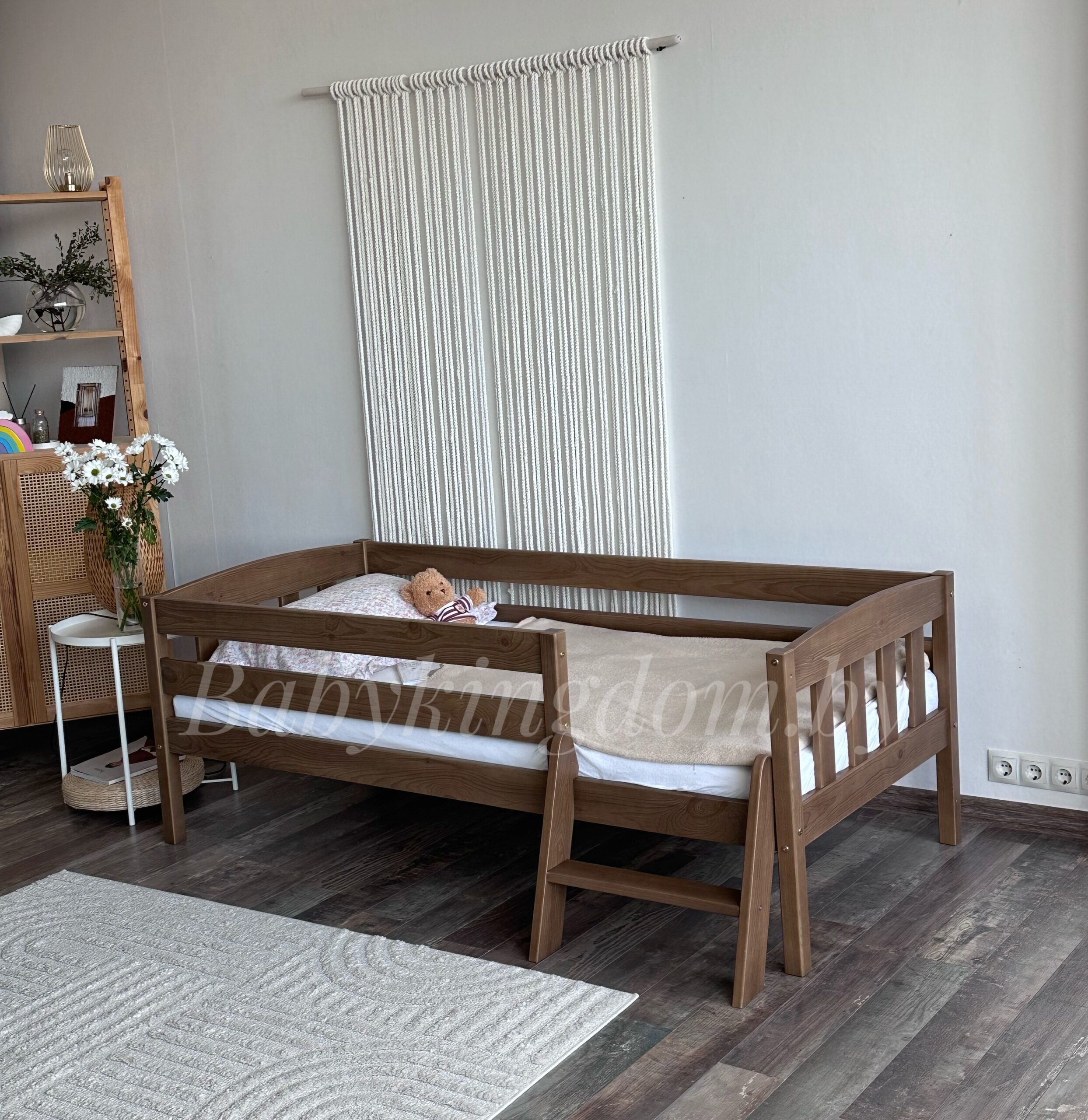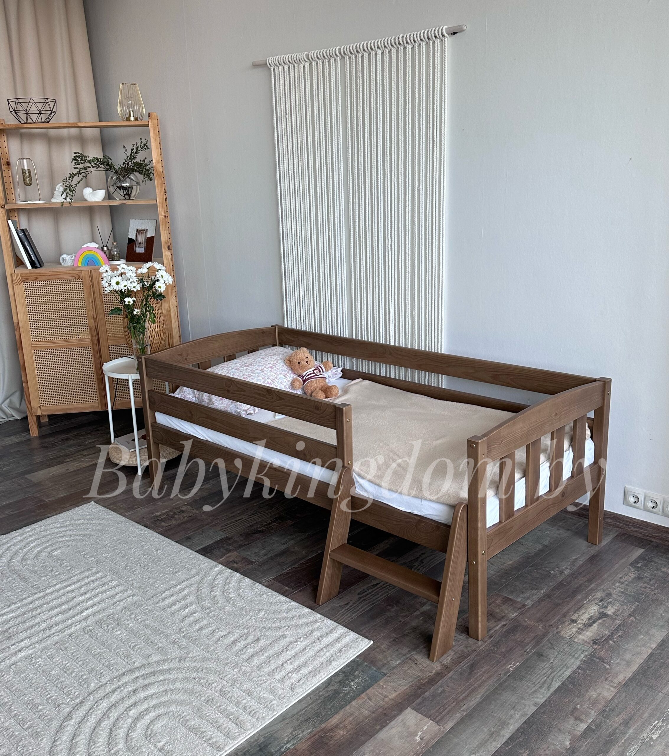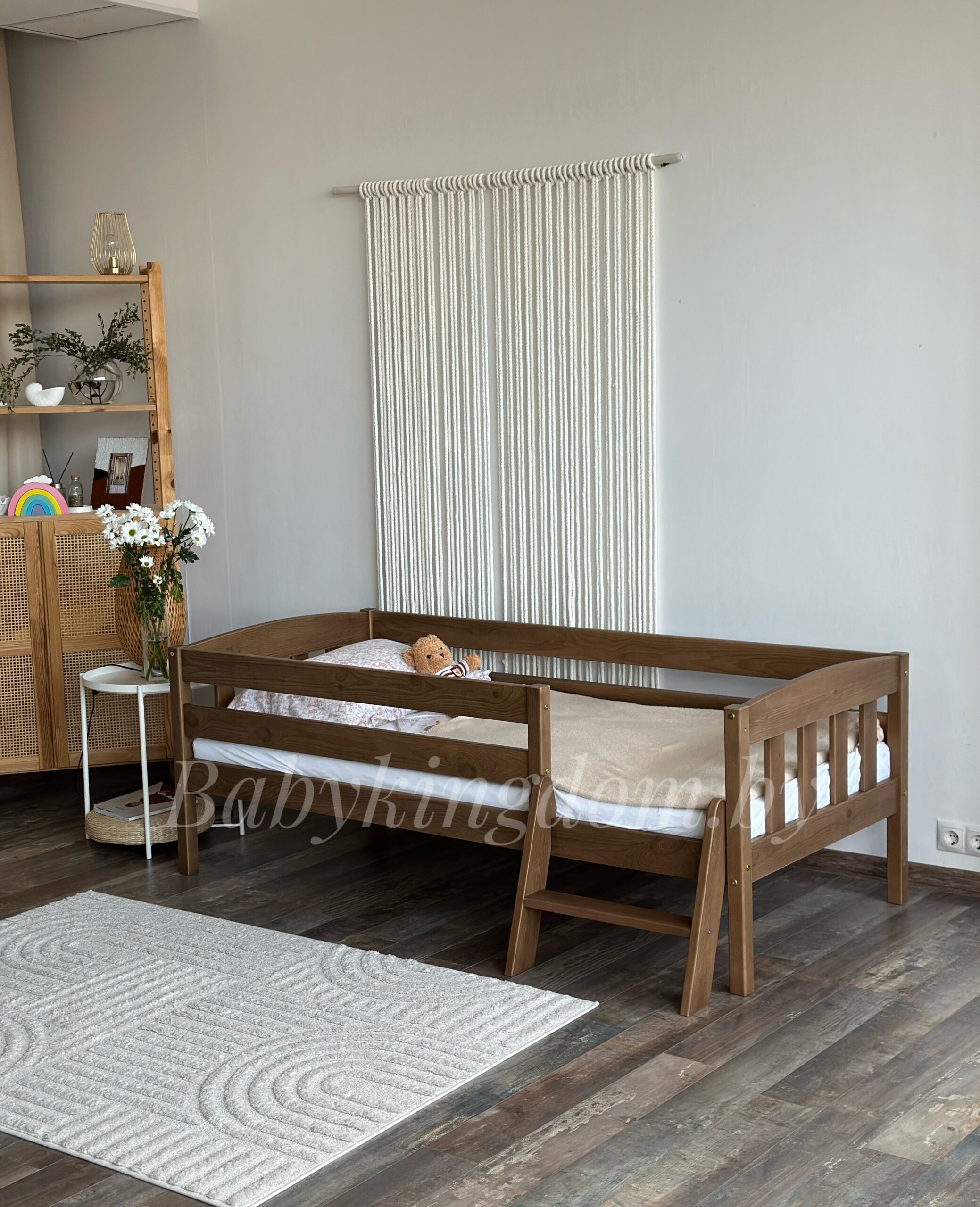 Однако, не только качество материала делает эту кровать привлекательной. Оригинальный дизайн, включающий в себя лесенку, добавляет функциональности и практичности. Лесенка позволяет вашему малышу безопасно и легко подниматься и спускаться с кровати, что особенно актуально для самостоятельных детей и кризисных периодов. Установить лесенку можно как с правой, так и с левой стороны. Геометрические формы и мягкие линии в дизайне создают атмосферу игры и веселья – дети быстро найдут тысячу вариантов использования кровати в своих забавах.