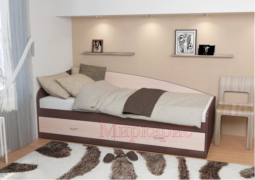 Спальное место: 200х90 см. Материал: МДФ покрытый плёнкой, ЛДСП.