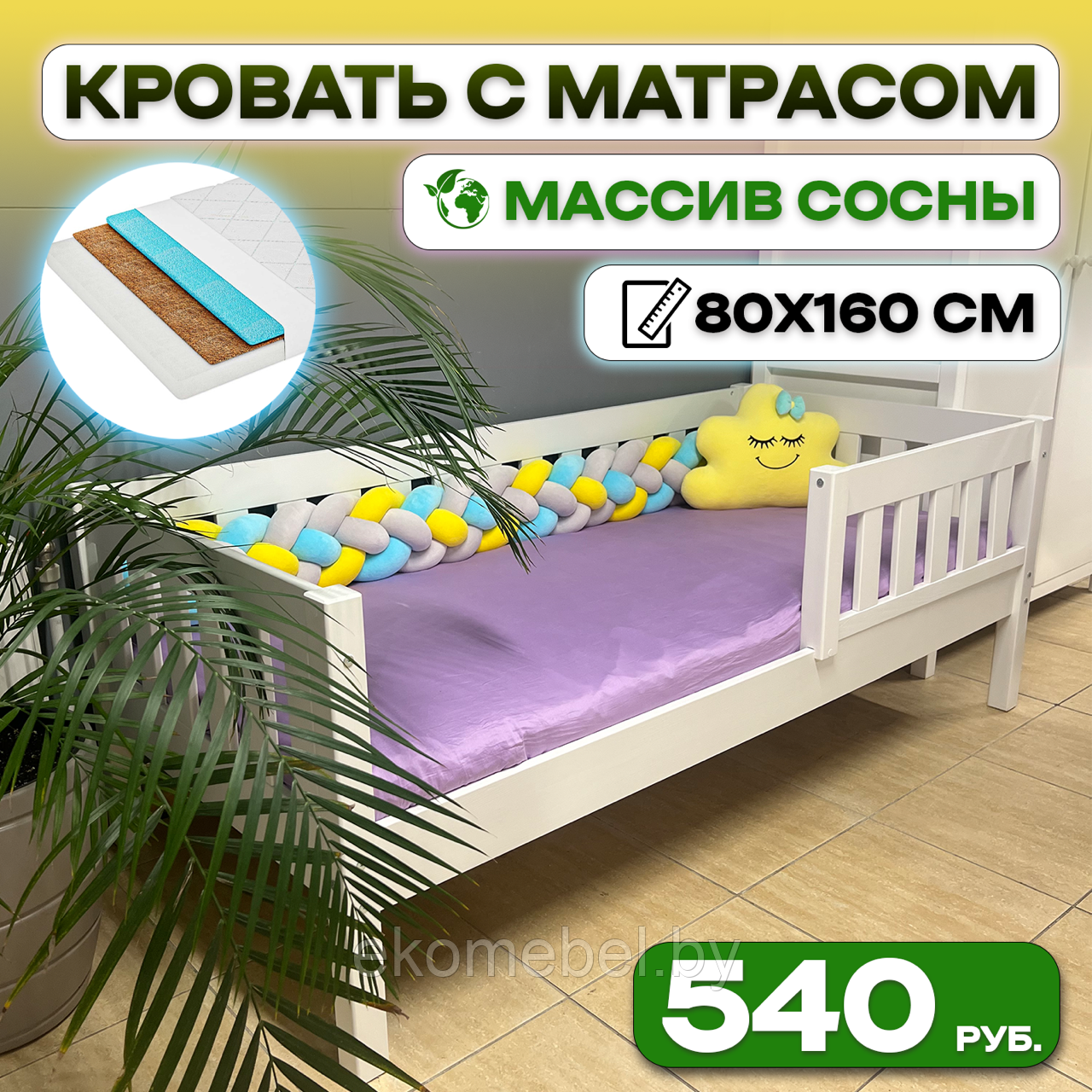 Благодаря компактным размерам (80х160 см), кровать подходит для детей от 2 лет и экономит пространство. Высокий съёмный бортик обеспечивает дополнительную безопасность во время сна, а деревянный прочный настил выдерживает нагрузку до 110 кг.