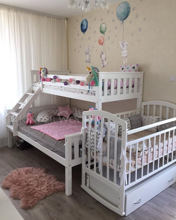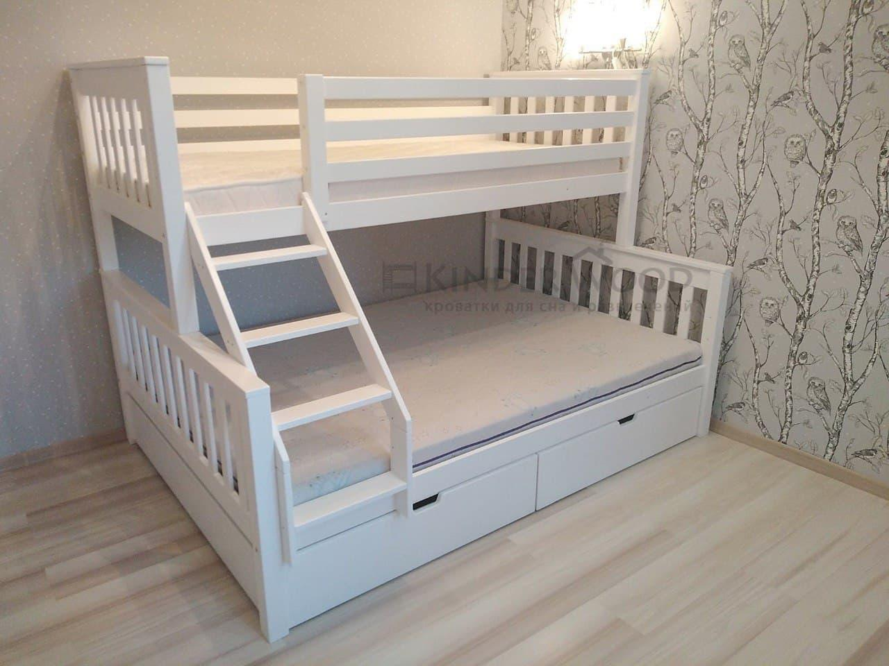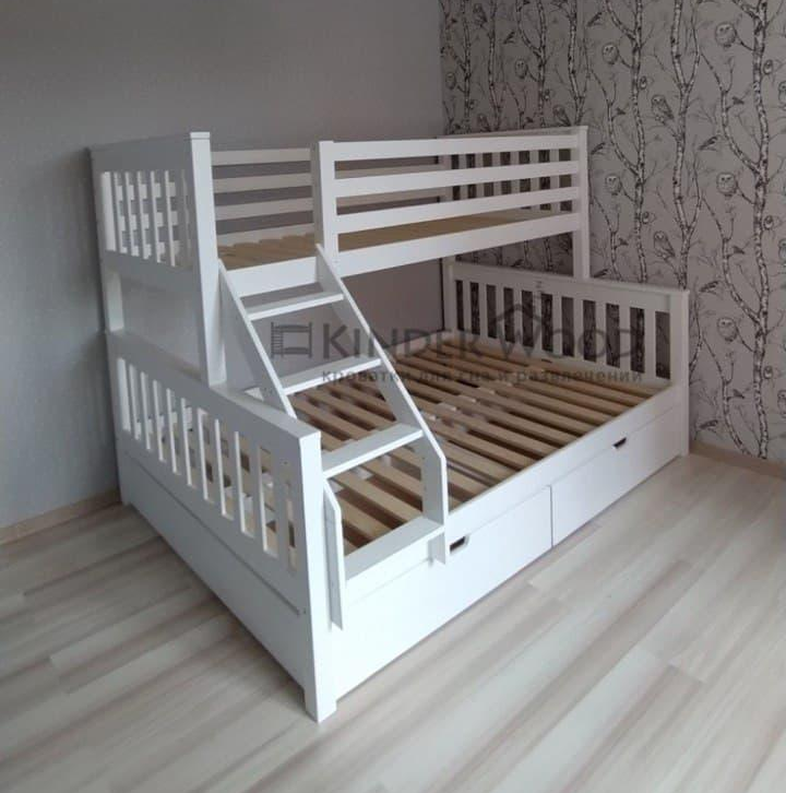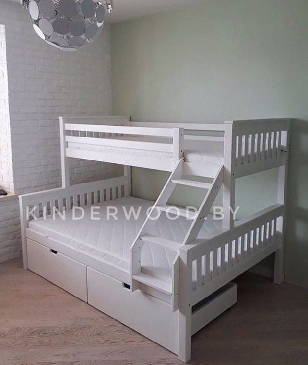 Очень интересный и необычный вариант двухъярусной кровати для детей и родителей или же для подростка и ребеночка помладше. Снизу полноценная полуторная кровать ., а верху односпальная. Так же можно купить выкатные ящики под кровать для хранения вещей. Красивый и стильный дизайн плюс массив дерева придают этой кровати особый вид. Такие модели очень распространены в Европе и понятно почему, ведь это удобно, экологично и экономит место в квартире. Можно сказать вы покупаете две кровати, а занимаете площадь одно полуторной. Так же это не все плюсы данной модели, в будущем за счет того, что кровати крепятся между собой соединительным шипом, можно снять верхнюю кровать и поставить отдельно или переместить в другую комнату. Так вы получите отдельно стоящую полуторную и односпальную кровать! Приятный бонус, не правда ли?