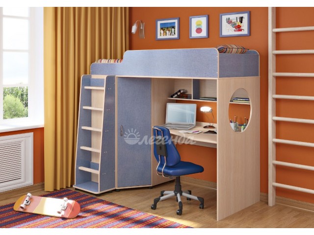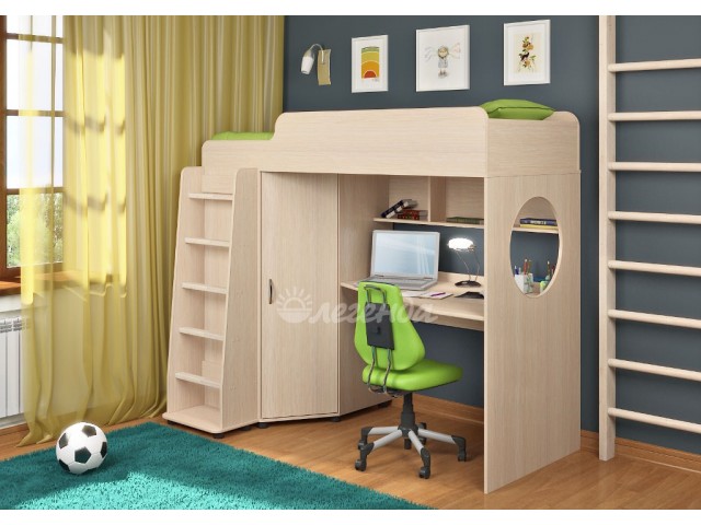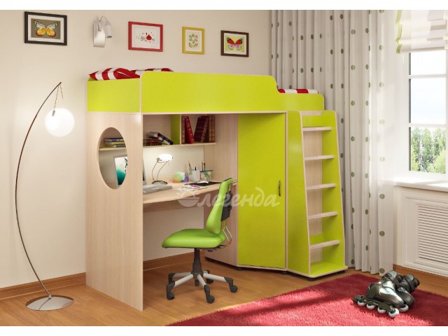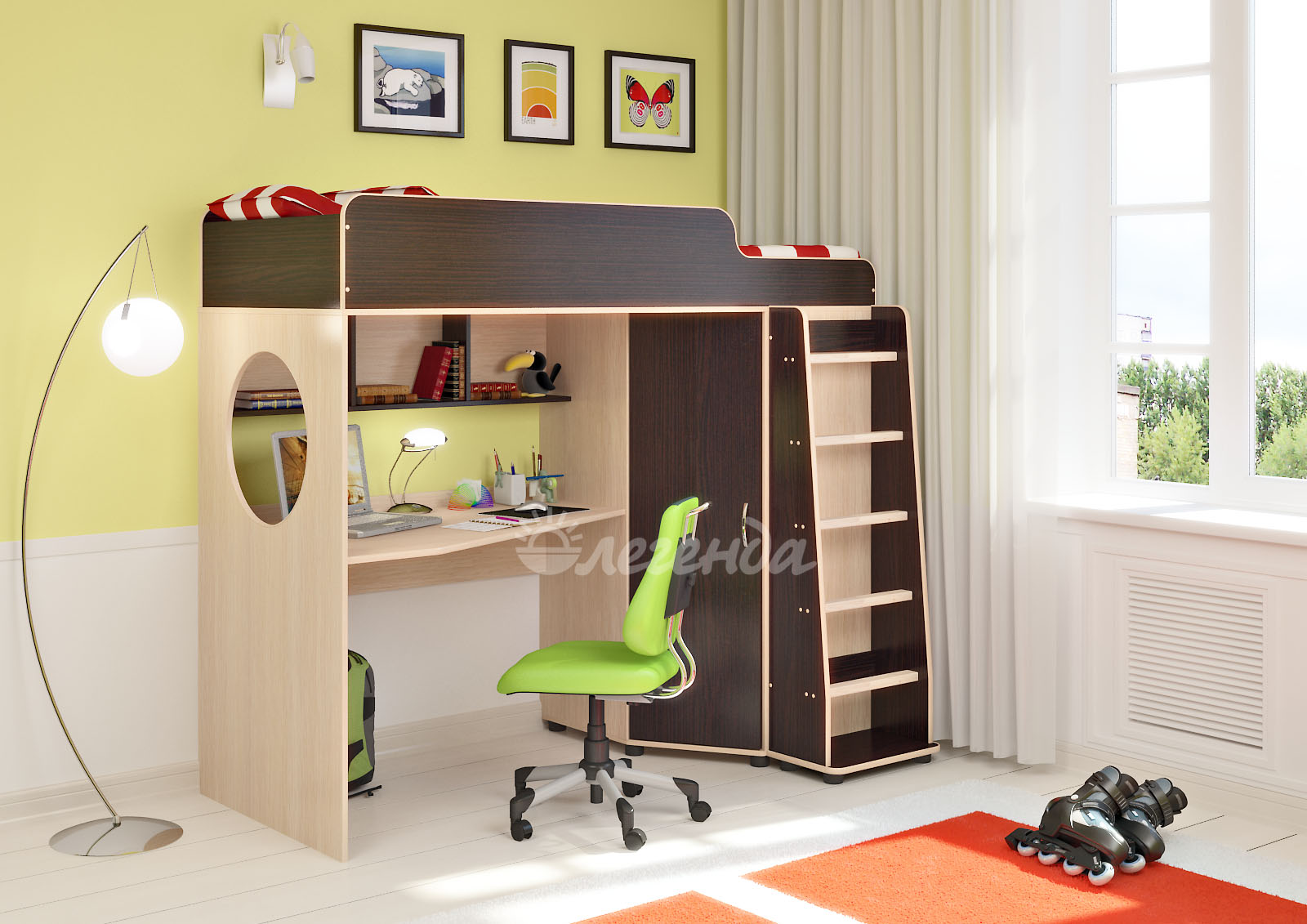 Кровать чердак Легенда 4.1: эргономичное и функциональное решение для площадей малых габаритов с совмещением рабочего и спального места. Учебная зона со столом под спальным ярусом располагает к комфортным занятиям, письму, работой за ноутбуком или компьютером. Над столом располагается трёхсекционная встроенная полкадля хранения книг, учебных материалов и других нужных предметов для развития ребенка, а световое окно сбоку от стола даёт дополнительное освещение. Встроенный удобный и практичный шкаф - невероятно вместительный за счет угловой конструкции с дверцей в диагонали, полками и штангой для плечиков. Удобная прямая лестница из массива сосны позволит с легкостью ребенку подняться на спальное место. Комплект может быть собран как на левую, так и на правую сторону.