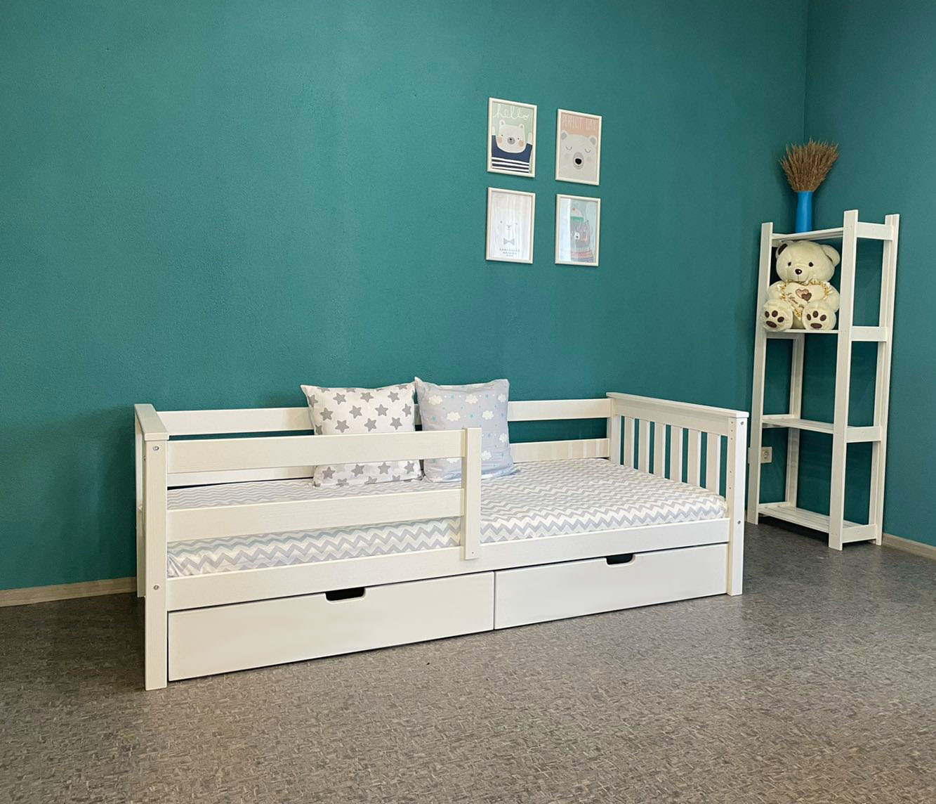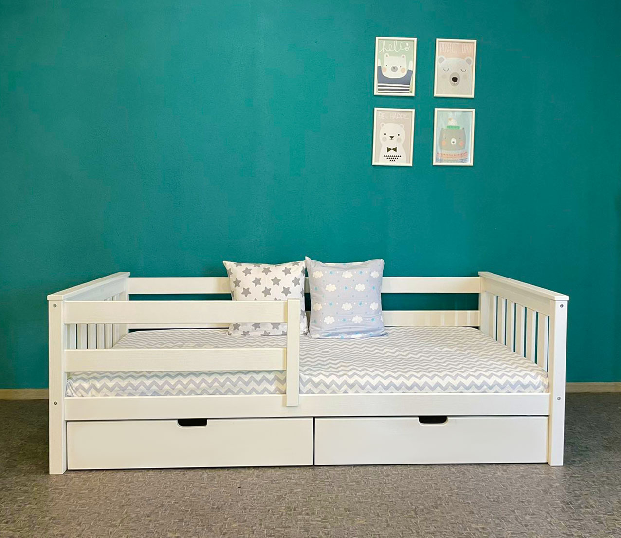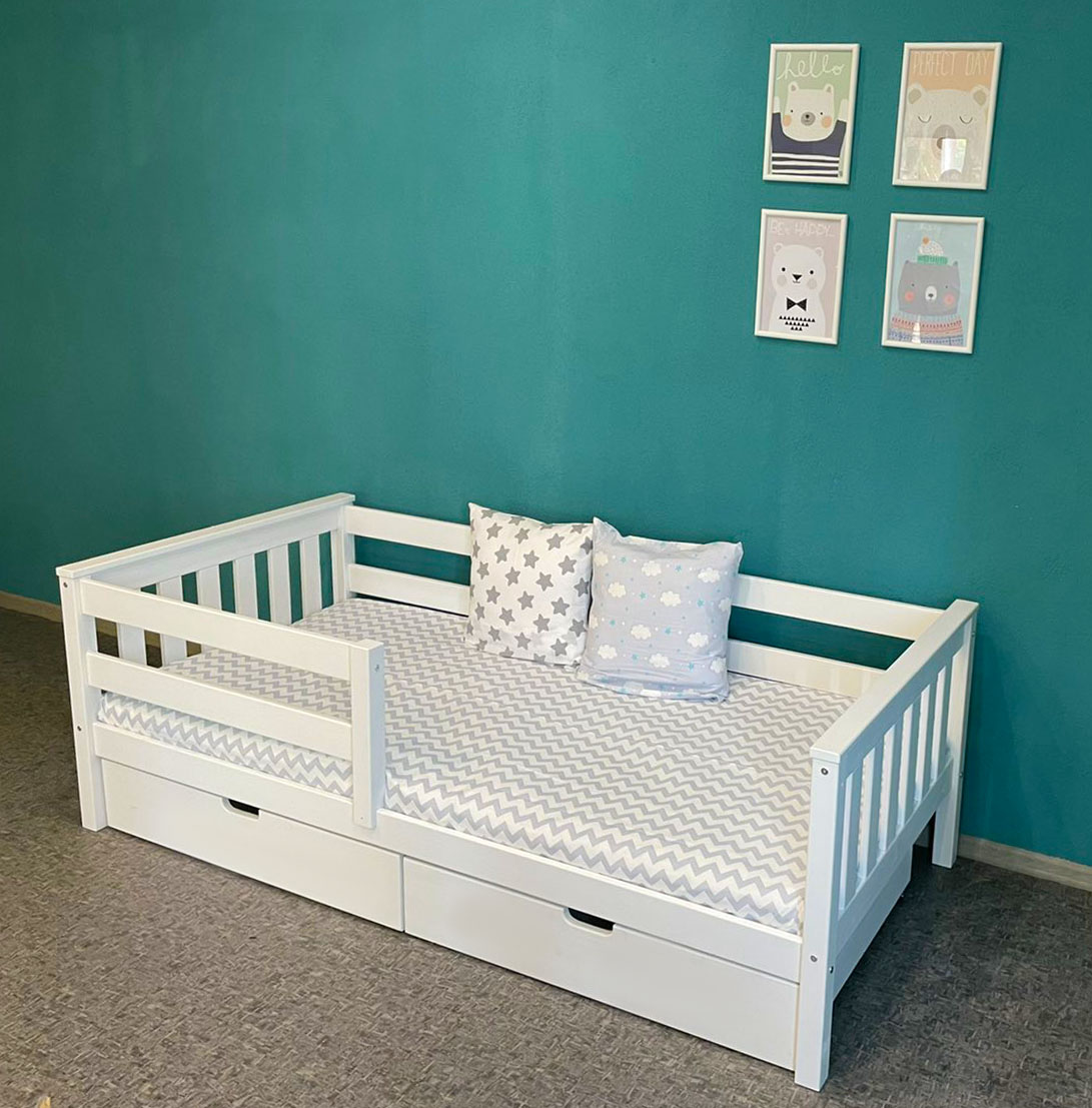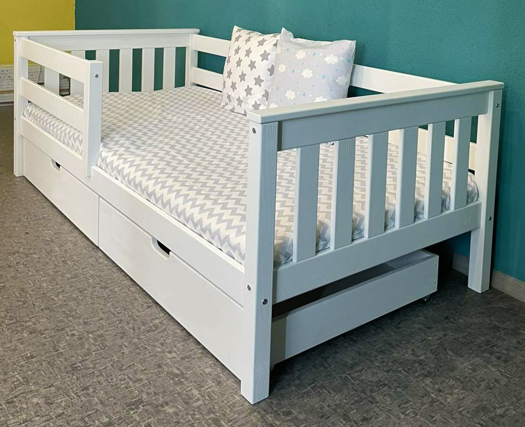 В комплекте: выдвижной ящик 2 шт., бортик. Спальное место: 80х160 см. Материал: массив сосны.