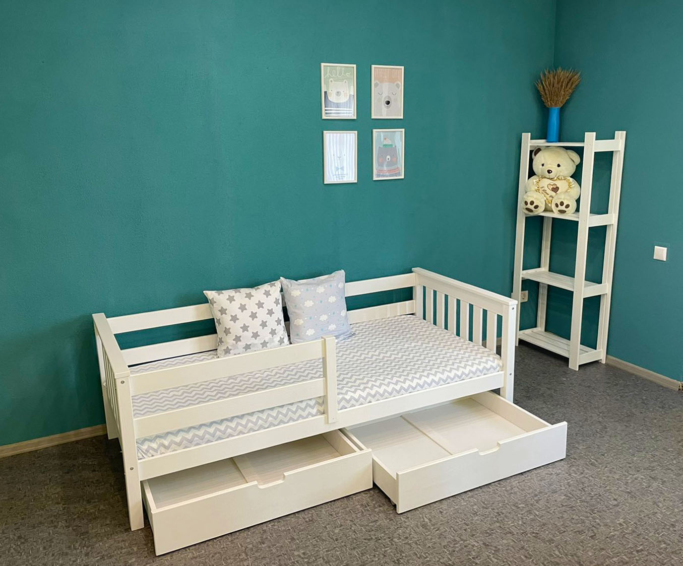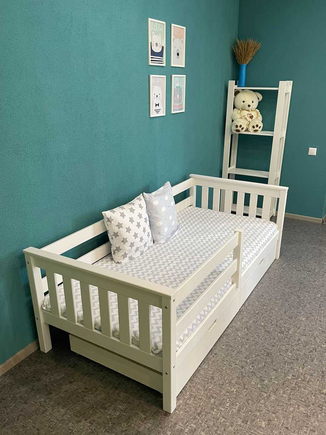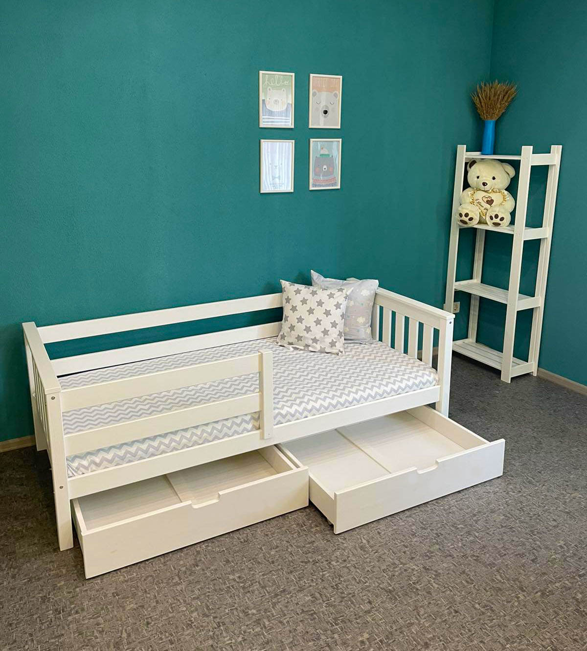 В комплекте: выдвижной ящик 2 шт., бортик. Спальное место: 80х160 см. Материал: массив сосны.