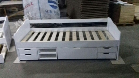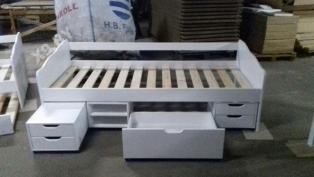 код 88436Детская кровать с блоком из множества шуфляд и полок под спальным местом.