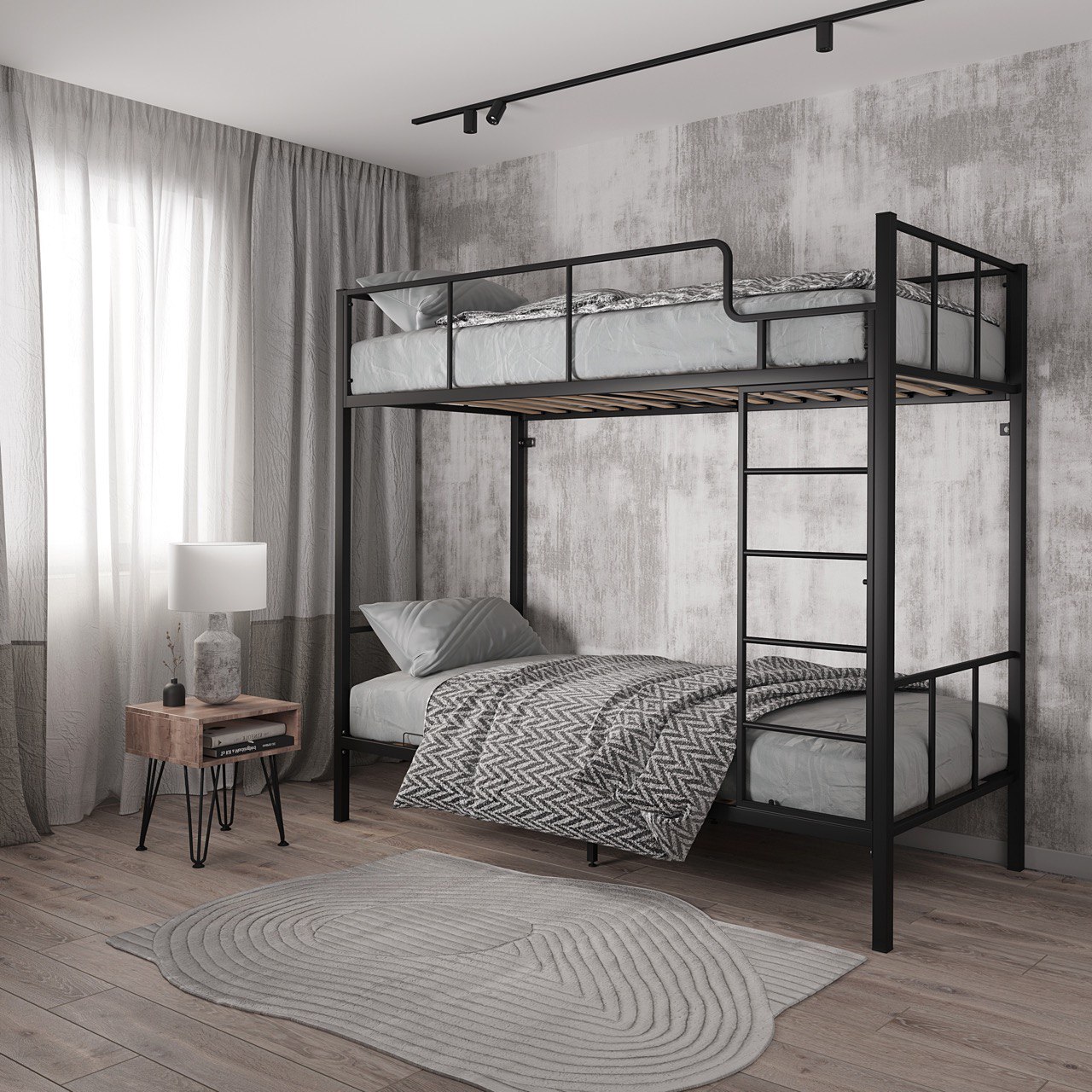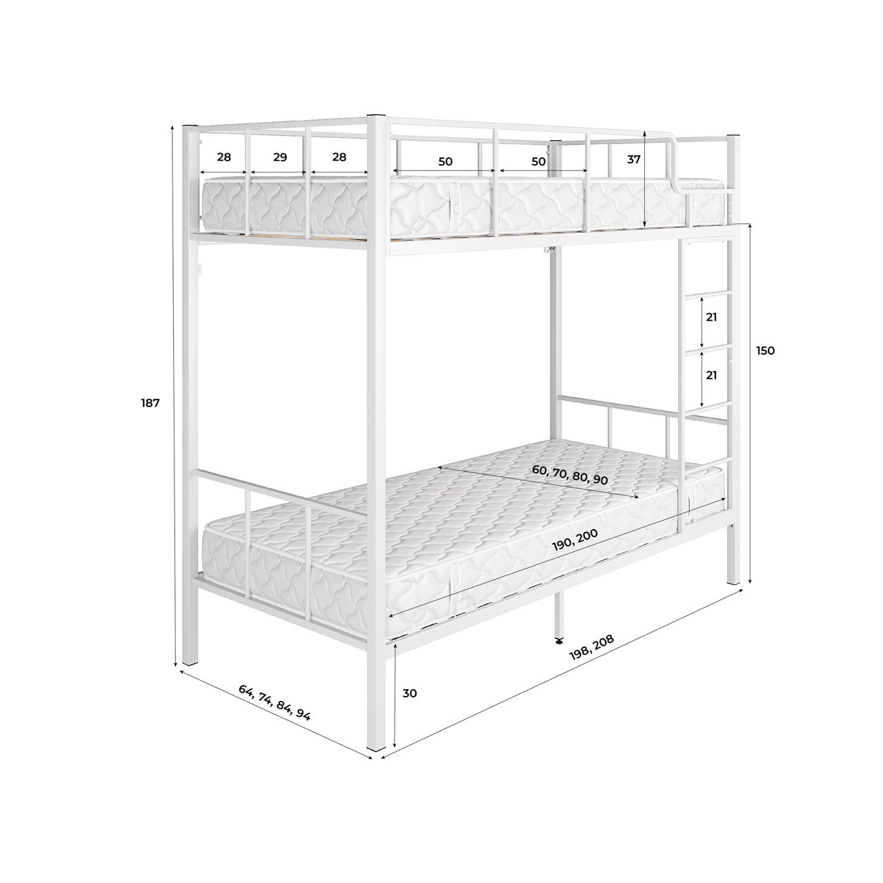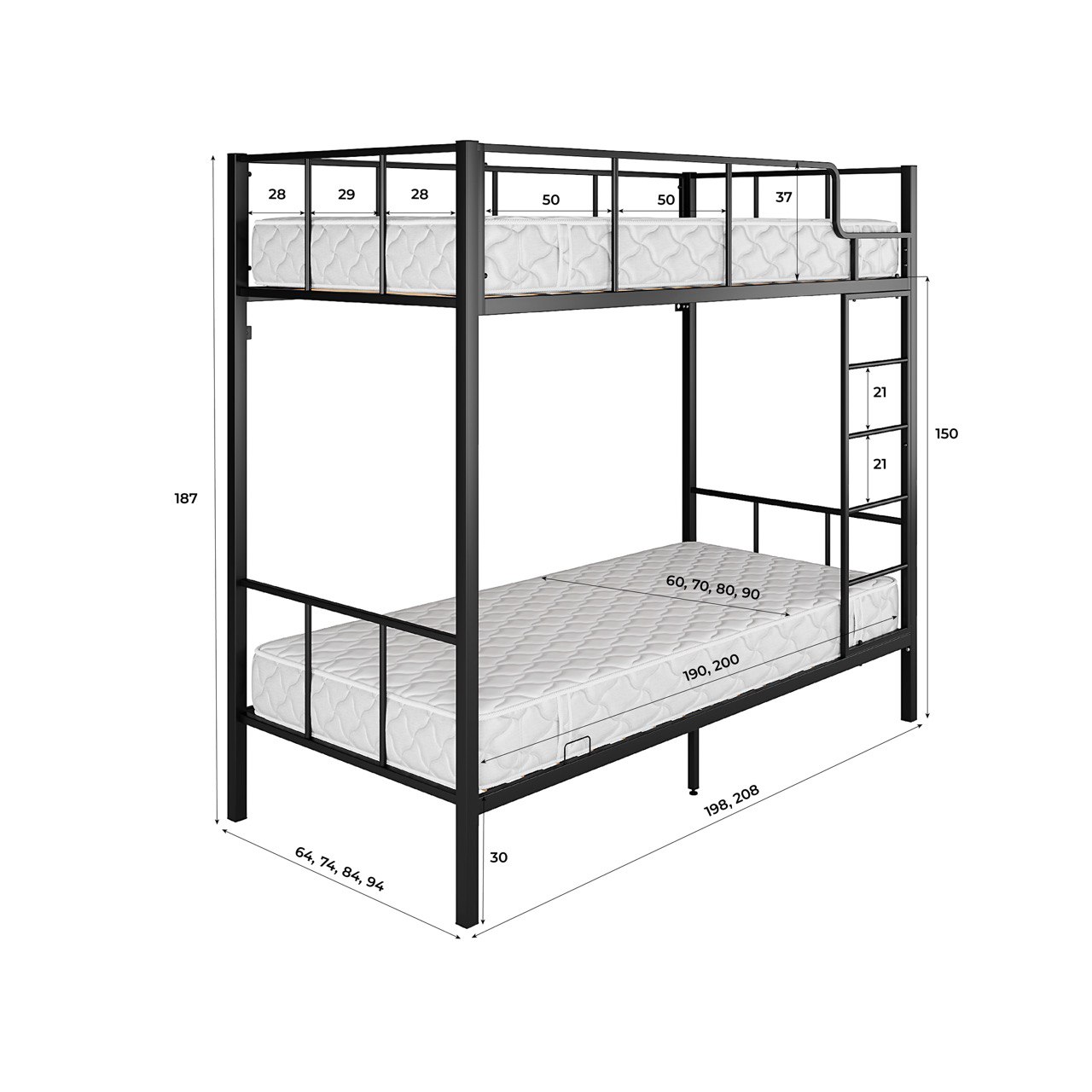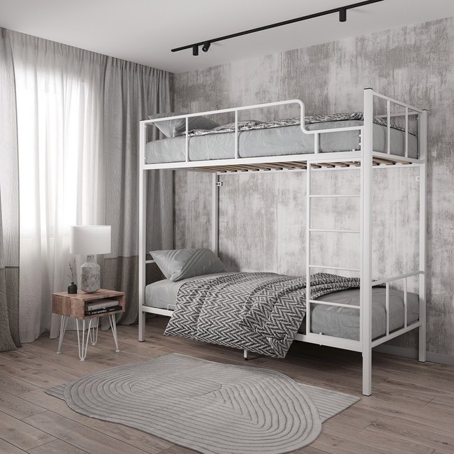 Кровать выполнена из прочного металла, что гарантирует надежность и долговечность. Она оснащена защитными бортиками и устойчивой лестницей с удобными ступенями, что делает подъем и спуск безопасным.