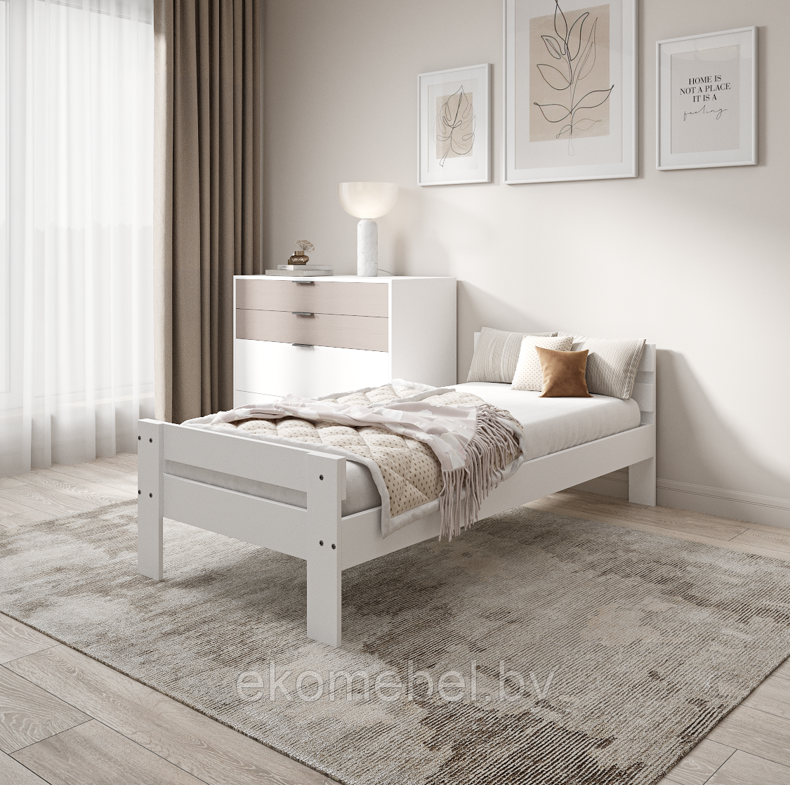 Спальное место: 90х200 см. Материал: массив сосны. В комплекте: выдвижной ящик 2шт., бортик.