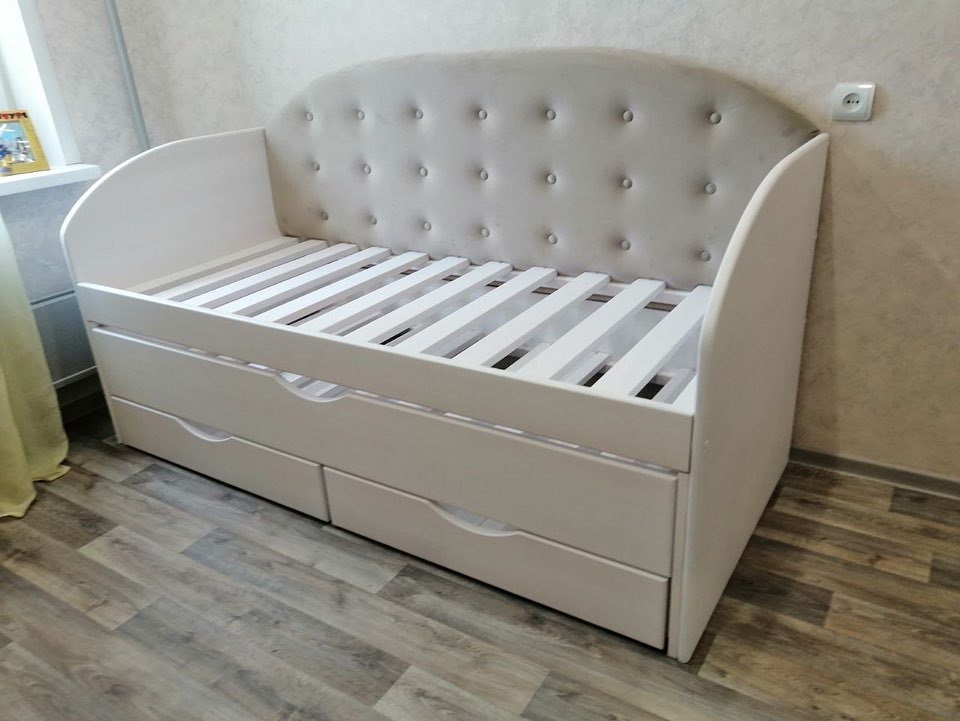 В комплекте: выдвижной ящик 2 шт., бортик 2шт. Спальное место: 80х160 см. Материал: массив сосны.