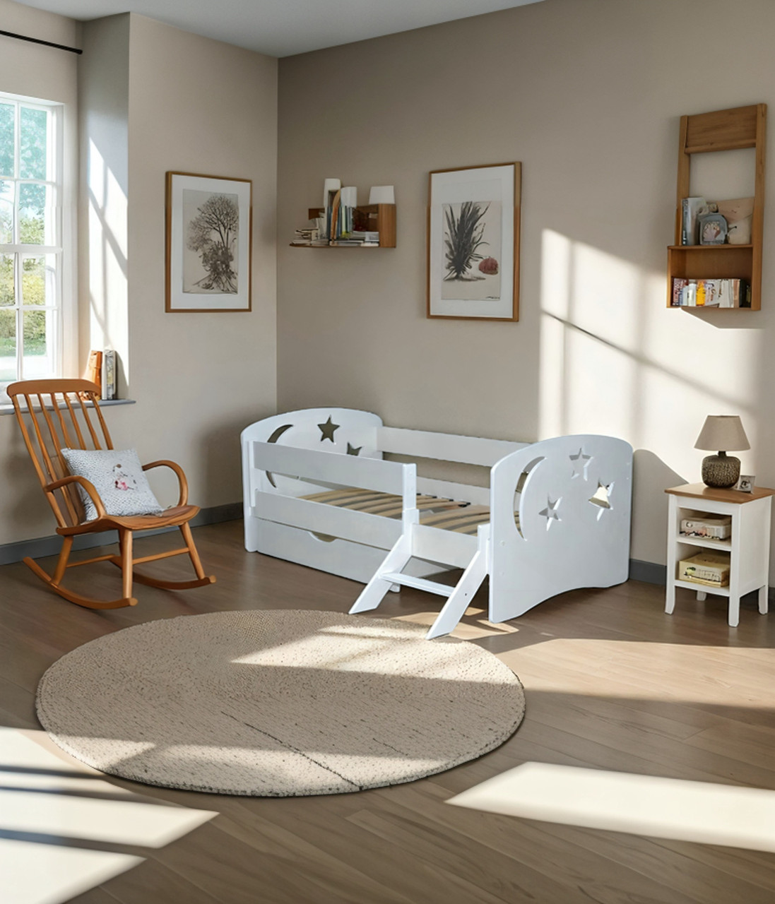 Оптимальная высота спального места от пола разработана для удобства и безопасности вашего ребенка. Съемный защитный бортик убережет ребенка от падения с кровати во время сна. Вместительный ящик станет дополнительным местом для хранения белья.