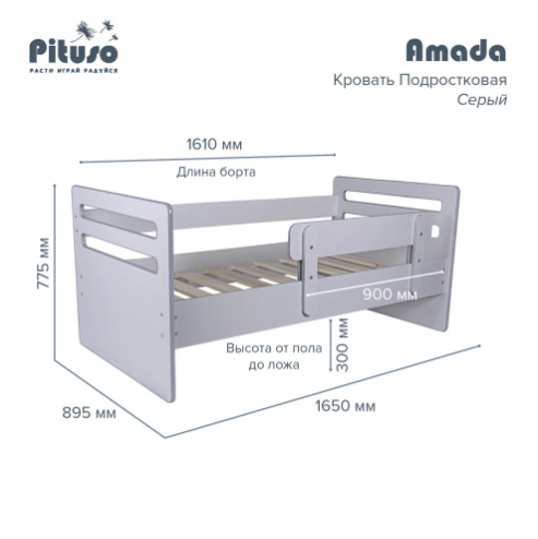 Кровать подростковая c бортиком «Pituso Amada New» Серый