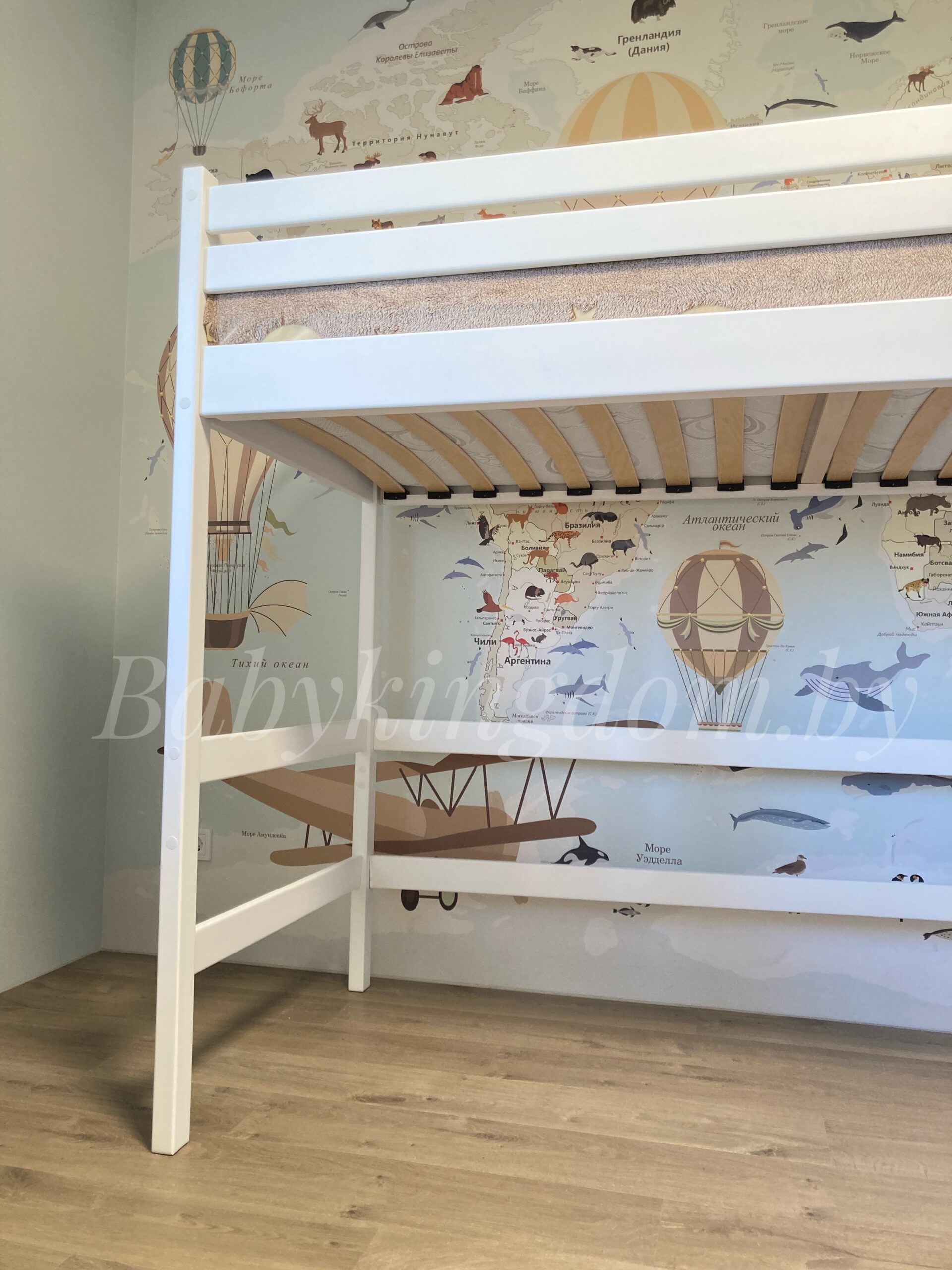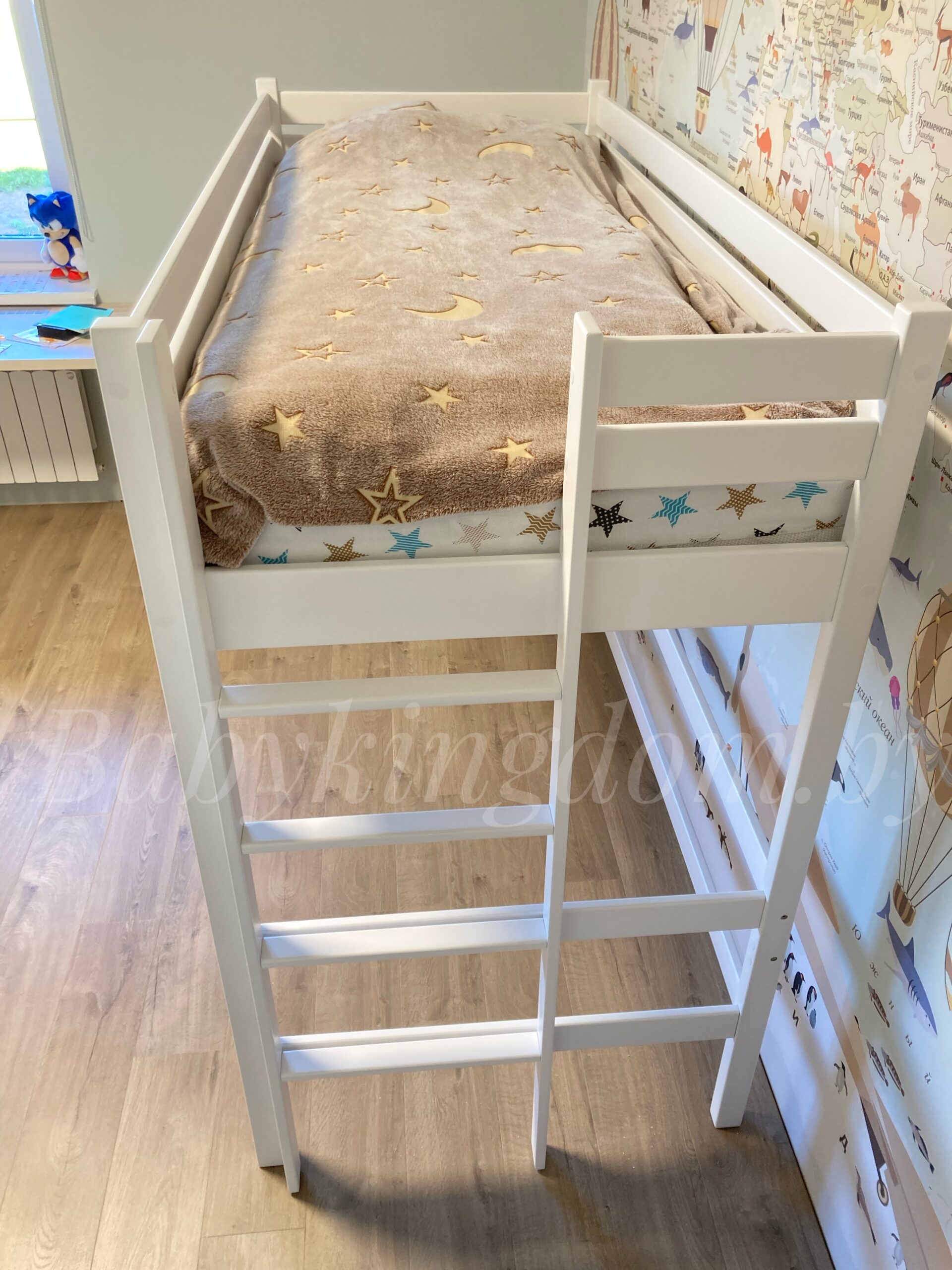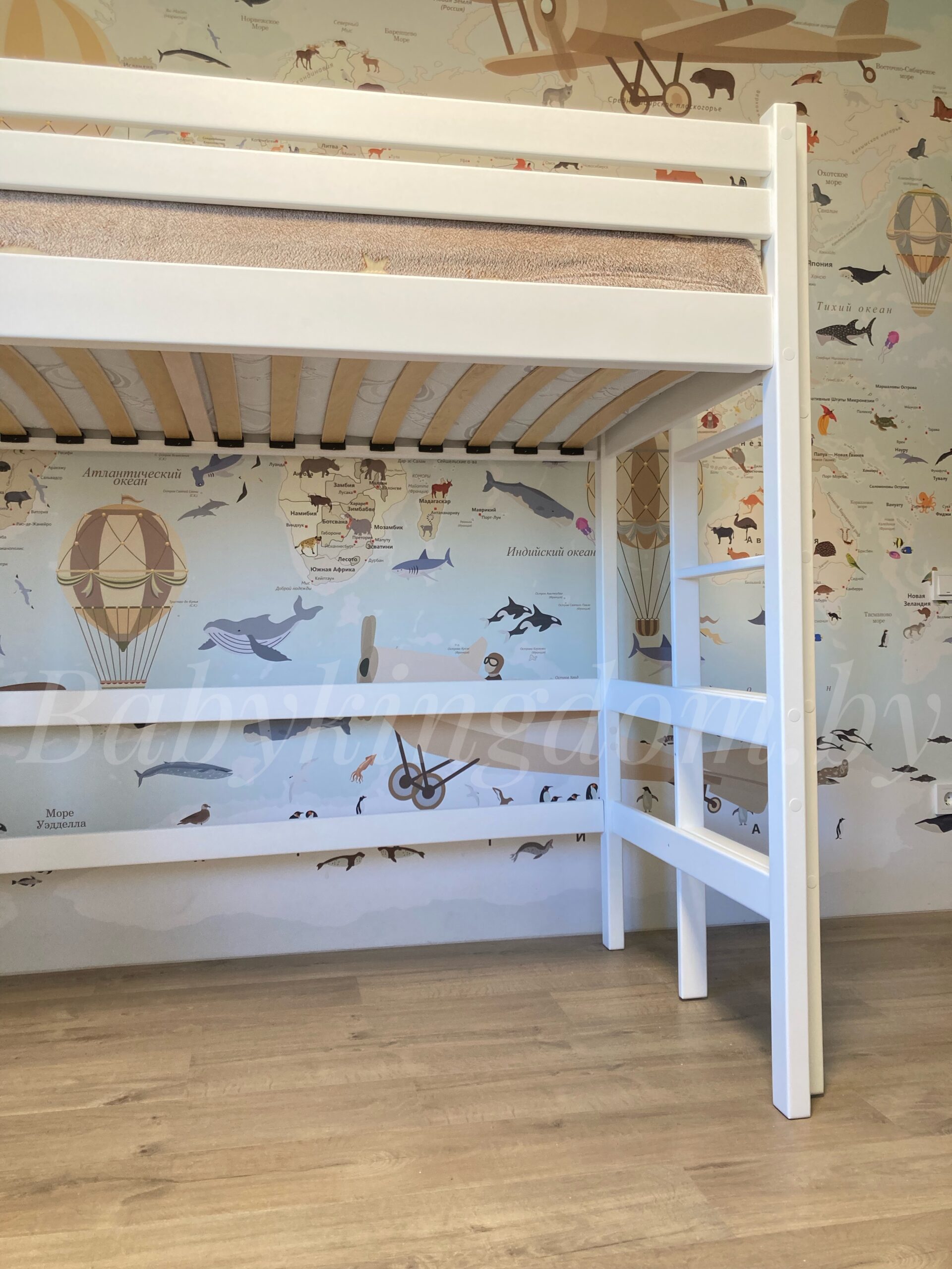 Надежная и мощная кровать с крышей из березовой фанеры, окрашенная в белый цвет полиуретановой краской.