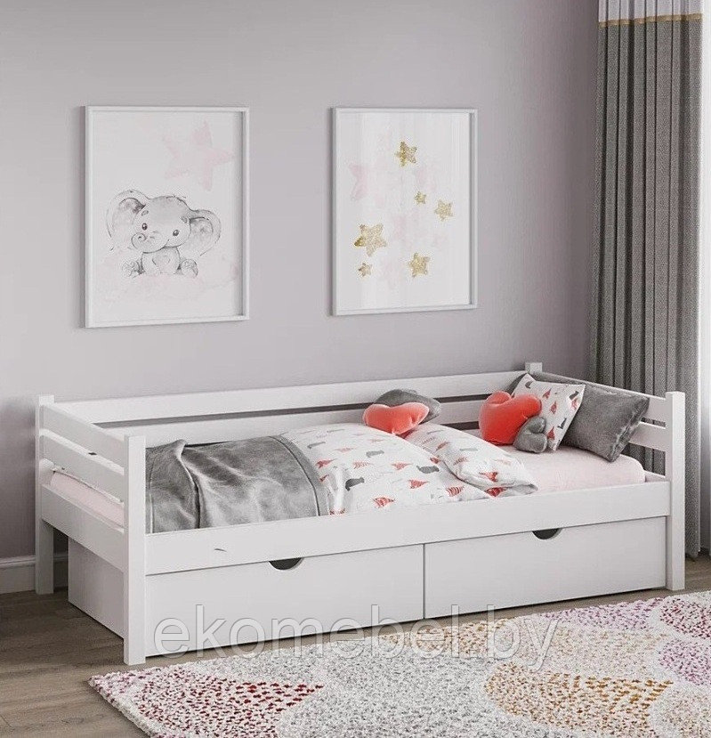 В комплекте: выдвижной ящик 2 шт. Спальное место: 90х200 см. Материал: массив сосны.