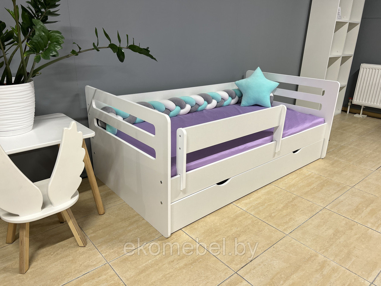 Кровать "Мода" оснащена ящиком для хранения белья и съемным бортиком, который обезопасит вашего ребенка во время сна.