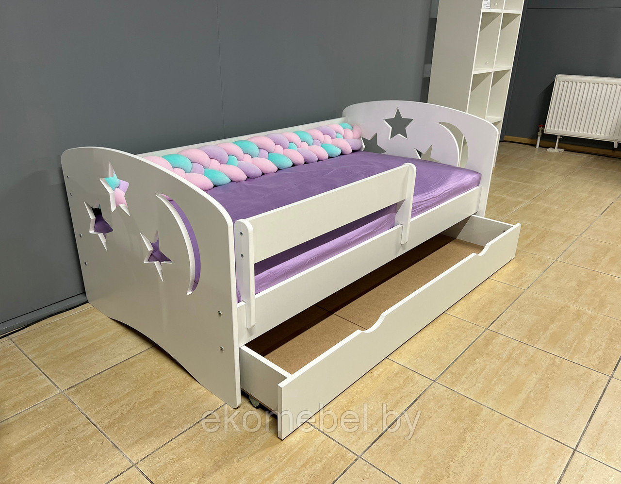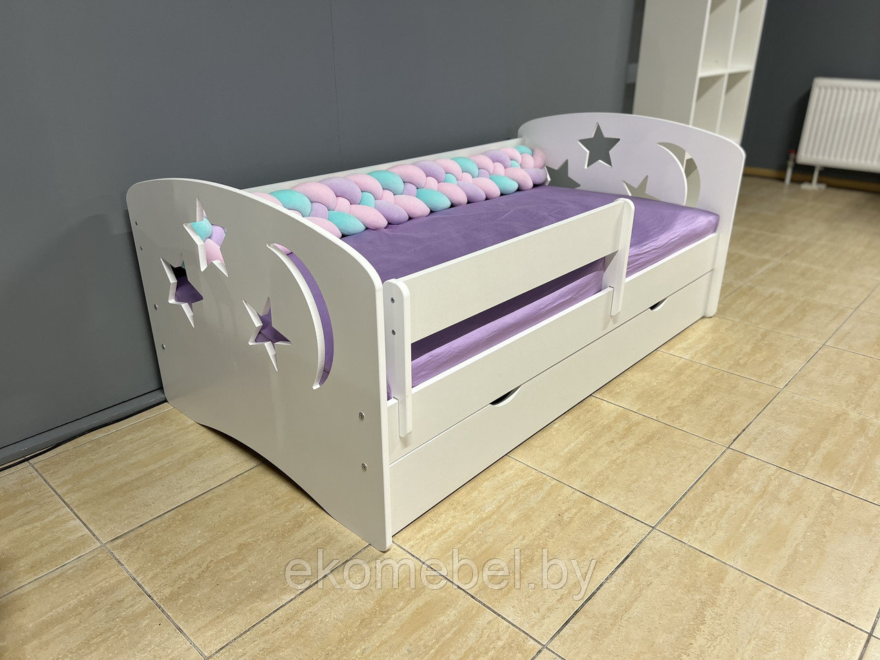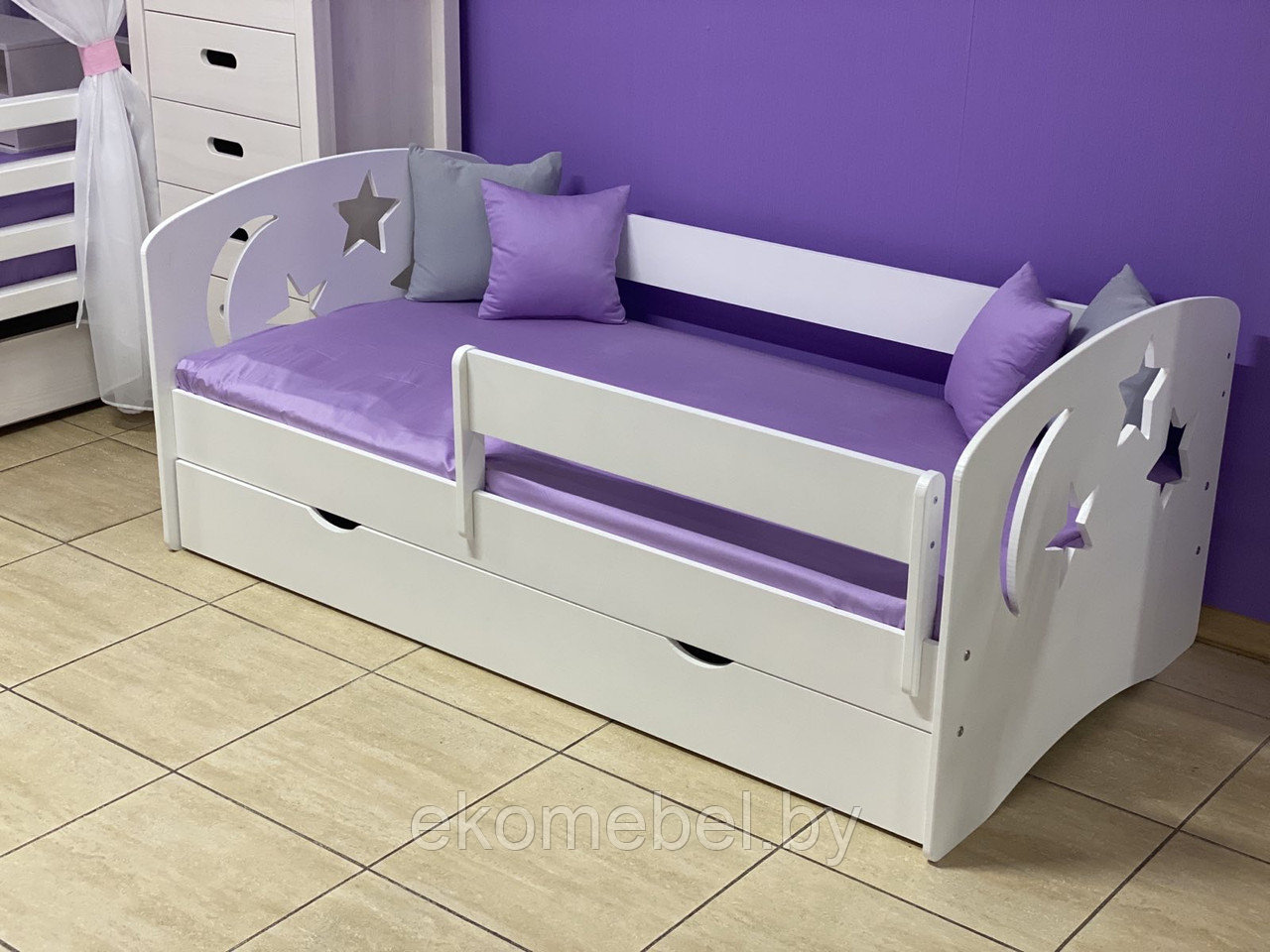 Кровать "Ночь" оснащена ящиком для хранения белья и съемным бортиком, который обезопасит вашего ребенка во время сна.