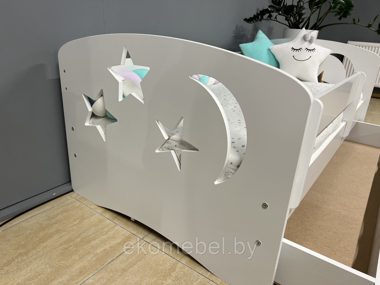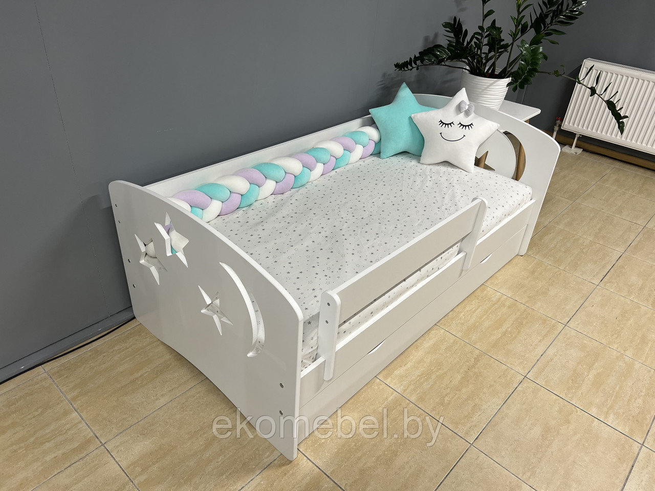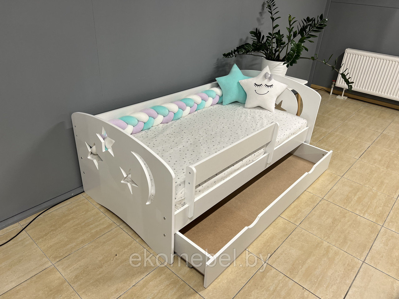 Кровать "Ночь" оснащена ящиком для хранения белья и съемным бортиком, который обезопасит вашего ребенка во время сна.
