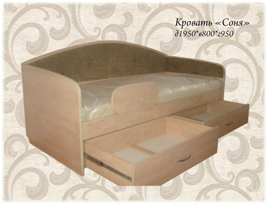 Кровать «Соня» предназначена для детской комнаты. Модель оснащена двумя выдвижными ящиками для белья и игрушек. Небольшой бортик обеспечит безопасный сон, не позволит ребенку упасть. Модель изготовлена из качественных и экологичных материалов.