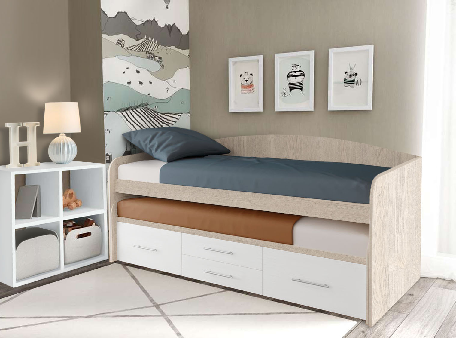 Выдвижная кровать с бежевым корпусом и белыми фасадами. Дополнена четырьмя выдвижными ящиками для хранения постельного белья. Нижнее спальное место оборудовано выдвижным механизмом, что значительно экономит пространство в детской комнате.