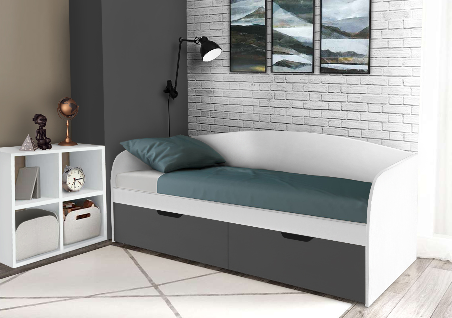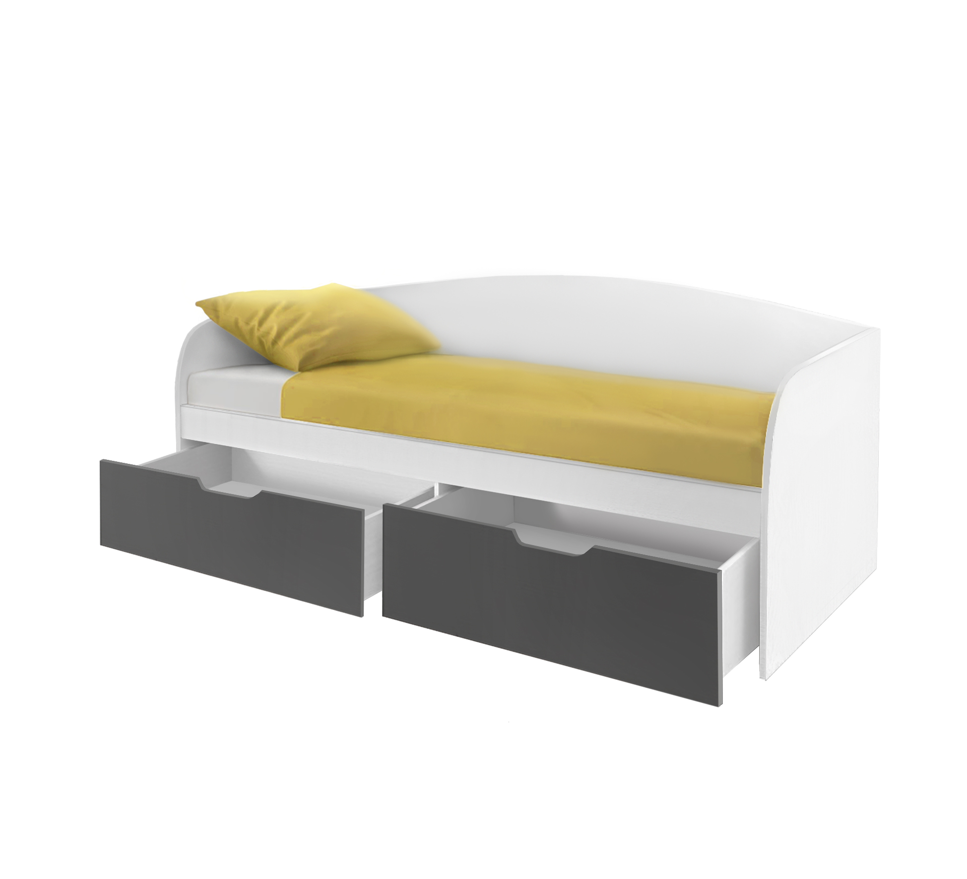 Детская кровать-тахта в контрастной черно-белой расцветке. Оснащена двумя просторными выдвижными ящиками, в которые поместится постельное белье. Второе спальное место сделано выдвижным, что значительно экономит место в детской комнате. Также добавлены боковины и задняя стенка.