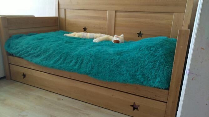 Спальное место: 200х90 см. Материал: массив сосны. Возможно изготовление в других размерах.