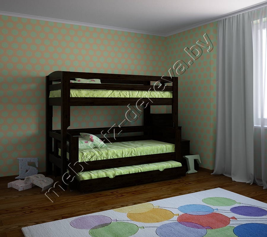 Кровать «Философ-3» с тремя спальными местами — прекрасный вариант для обустройства современной детской комнаты. Комплекс можно оставлять в первоначальном виде или же расставлять ярусы по разные стороны комнаты, создавая тем самым дополнительную игровую зону под кроватью-чердаком. Лестница для подъема на самый верхний ярус представлена в виде невысоких ступенек с нишами внутри.