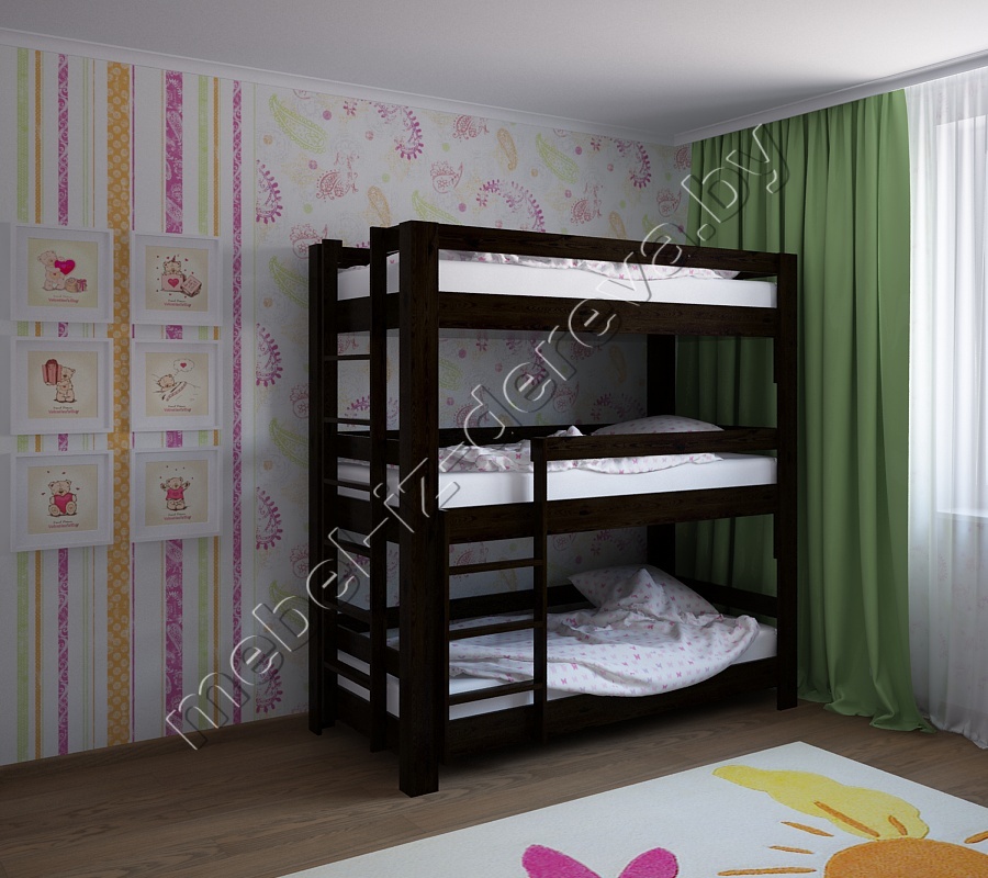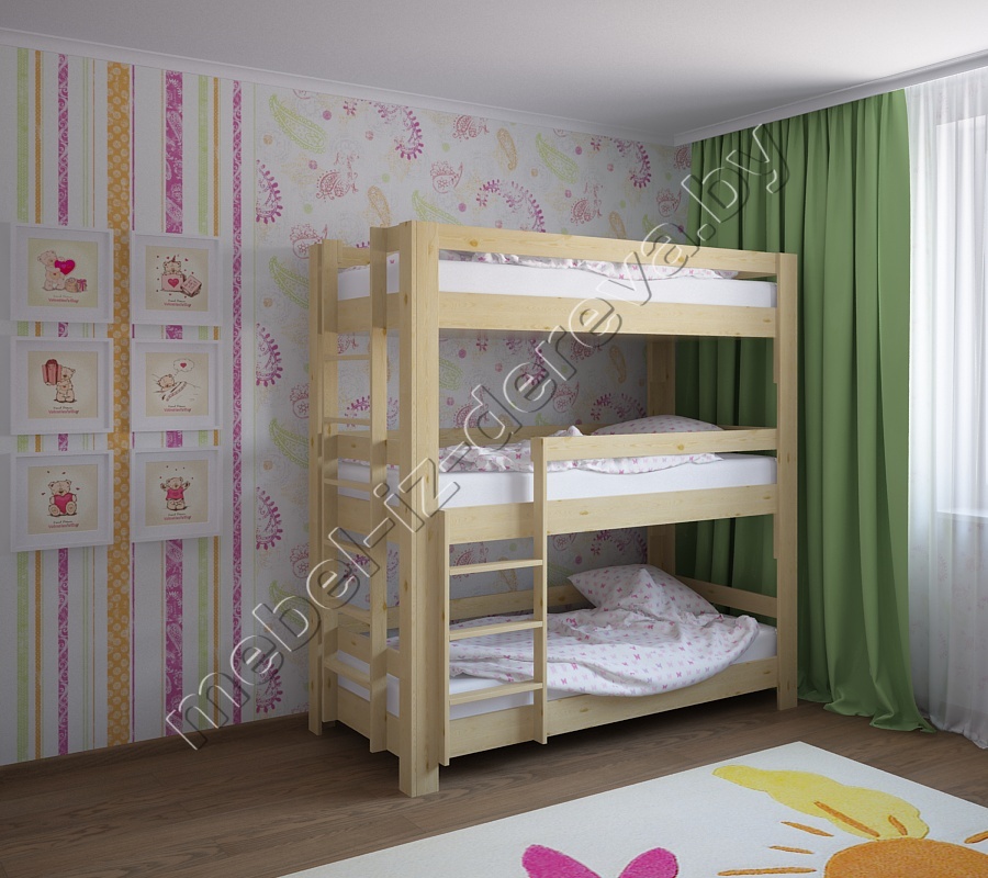 Компактная трехъярусная кровать — отличное решение при обустройстве малогабаритной квартиры. Два верхних яруса для надежности укомплектованы специальными бортиками, защищающими от случайного падения во время сна. Лестница для подъема на третий этаж может быть закреплена в любой удобной для детей части кровати.
