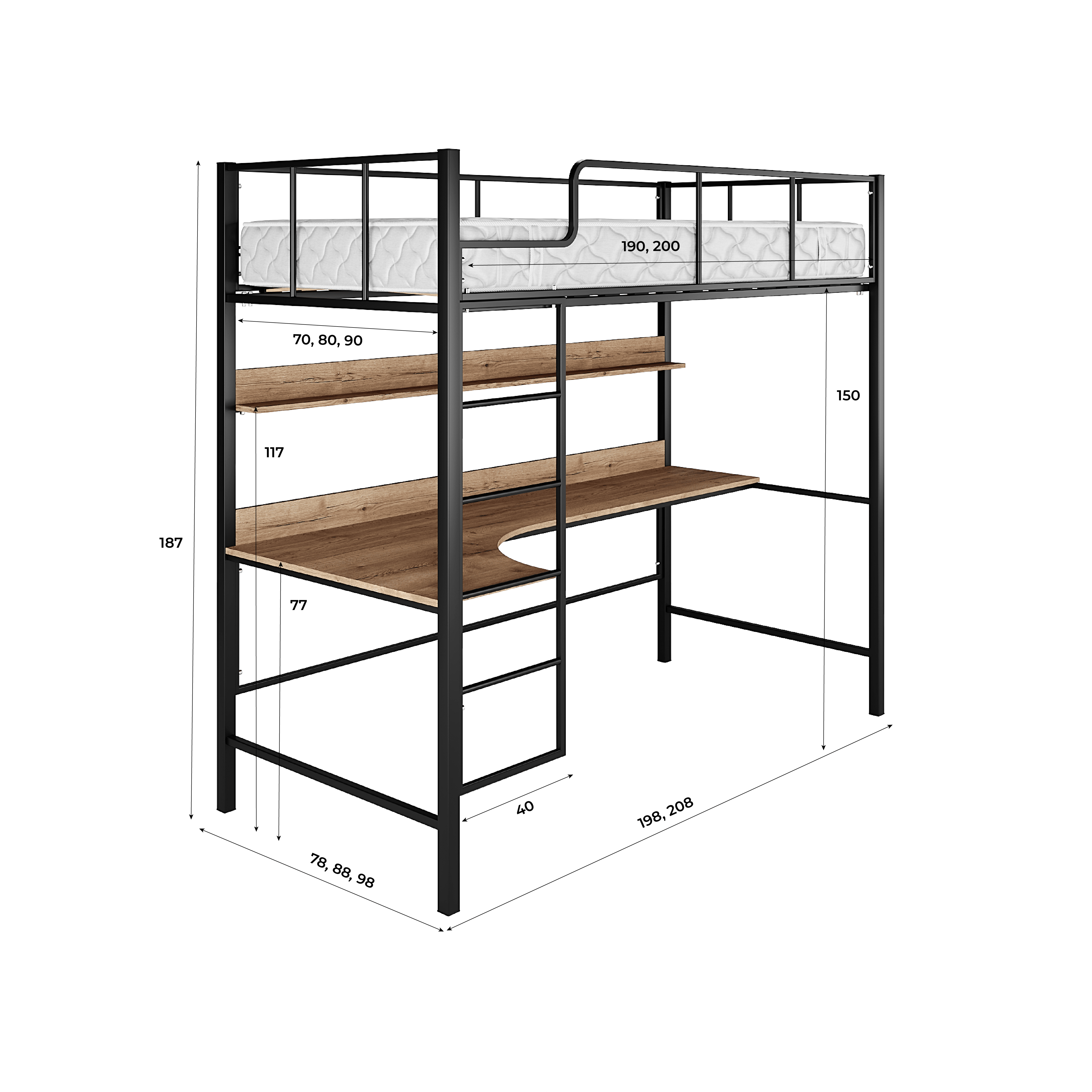 Кровать-чердак позволит создать уютную спальню, не перегрузив ее при этом мебелью. Преимуществом такой кровати является не только компактный размер, но и комфортное спальное место, совмещенное с рабочей зоной. Подъем на верх осуществляется по удобной лесенке, а сами кровати оснащены высокими бортиками, обеспечивающими безопасность. Добавит уюта и непринужденности интерьерам домов отдыха и хостелов. Изготавливается из металла. Кровать имеет экологически безопасное и качественное полимерное покрытие.