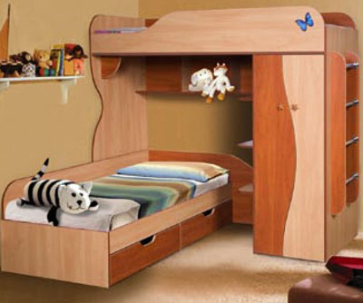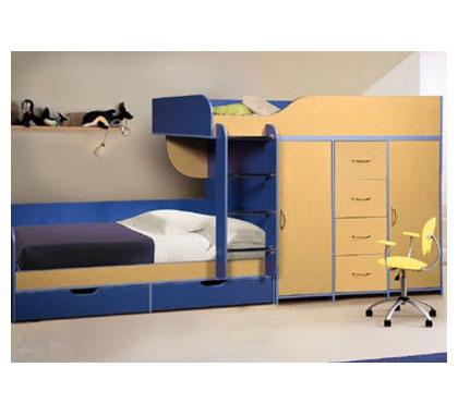 Набор мебели для детской «Альфа-3» отличается практичностью и многофункциональностью, так как имеет достаточно компактные размеры и хорошую вместительность всех ее элементов. Данная модель оборудована местом для сна и рабочим пространством, спальное место располагается сверху, что делает подъем к нему интереснее и веселей. Также имеется вместительный шкаф для хранения одежды, книг и игрушек.
