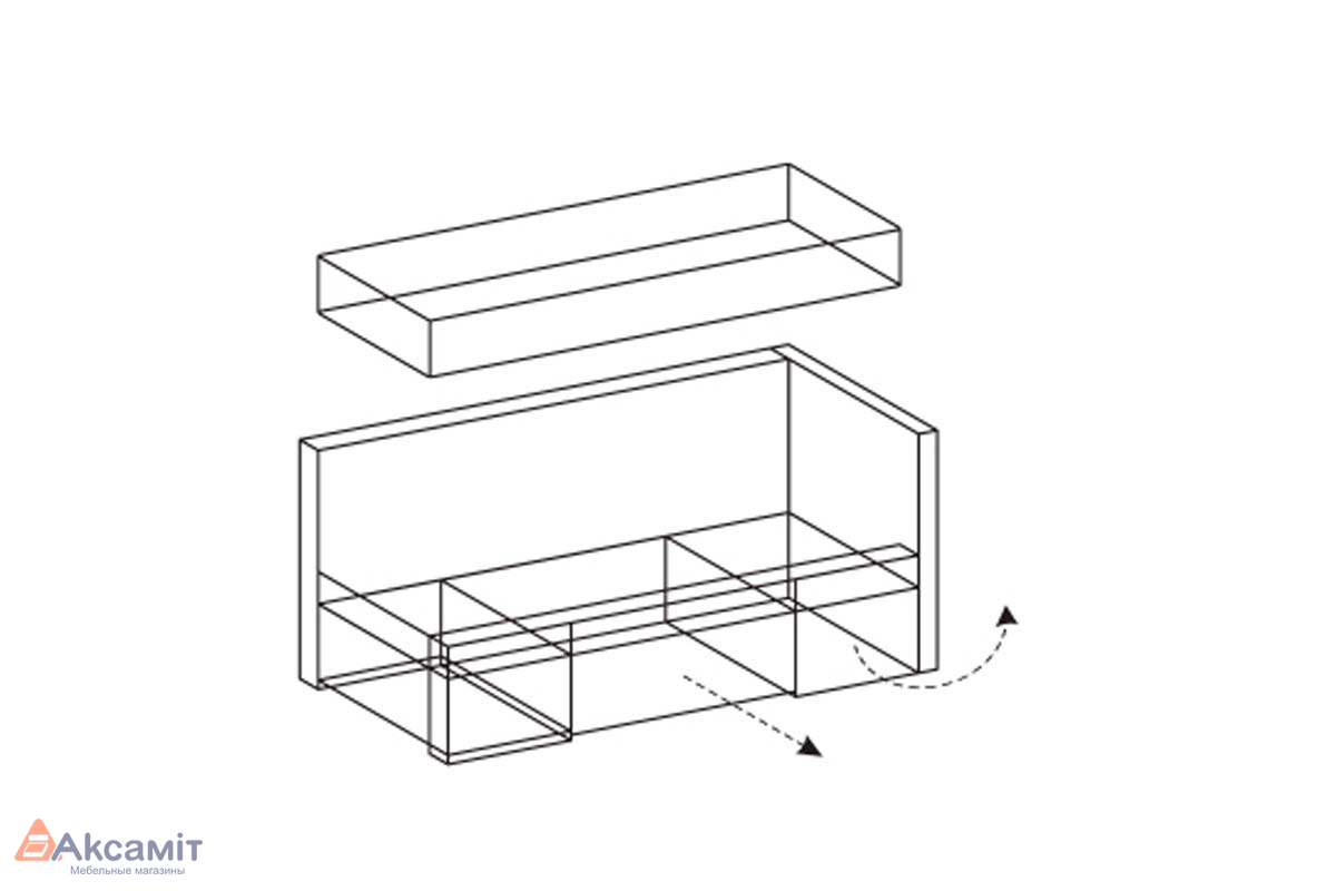 - Имеет один вместительный выдвижной ящик (размеры: ширина 966 мм, высота 215 мм, глубина 418 мм) на колесных опорах, один закрытый ящик с распашным фасадом и одну открытую нишу;