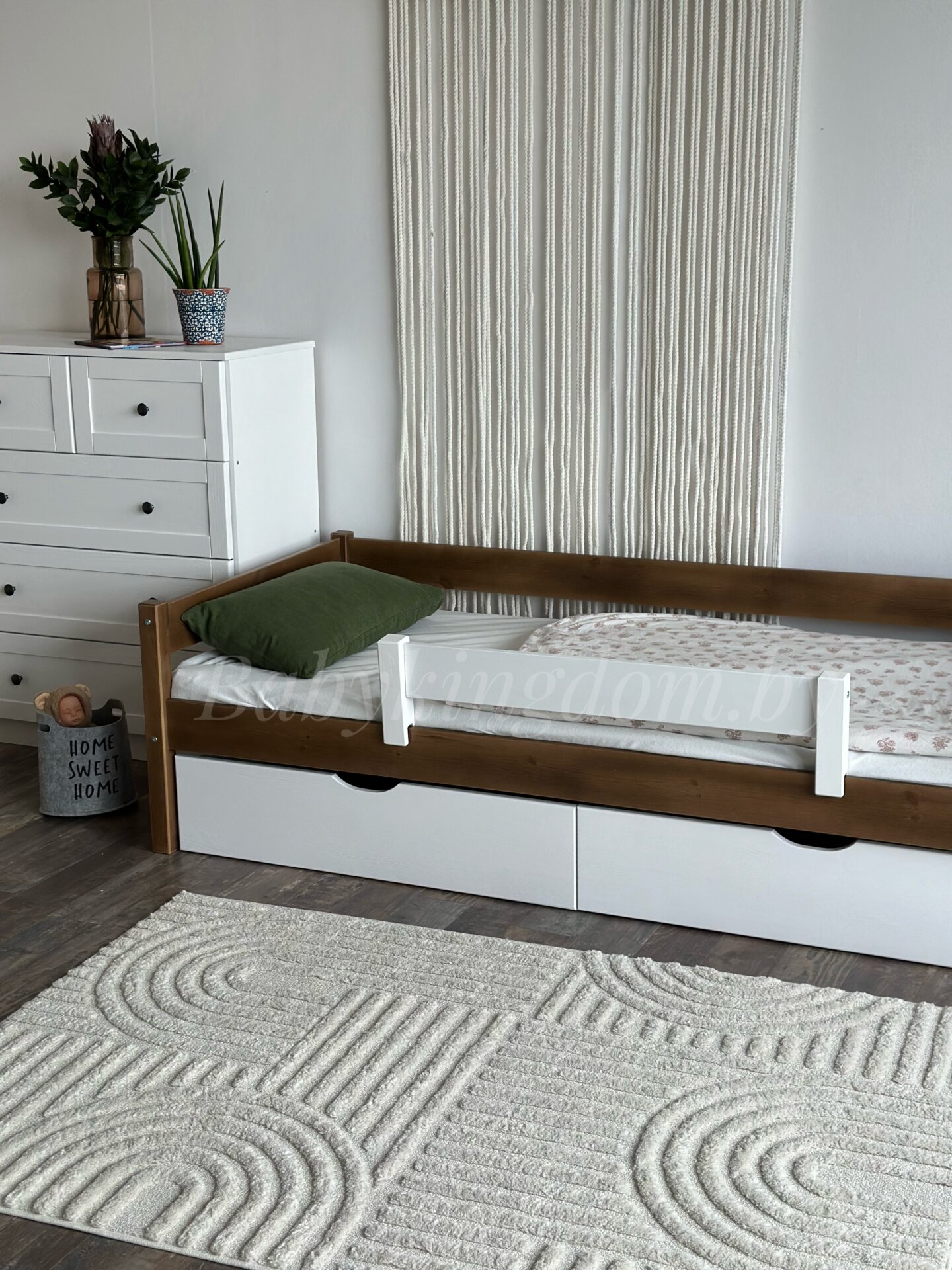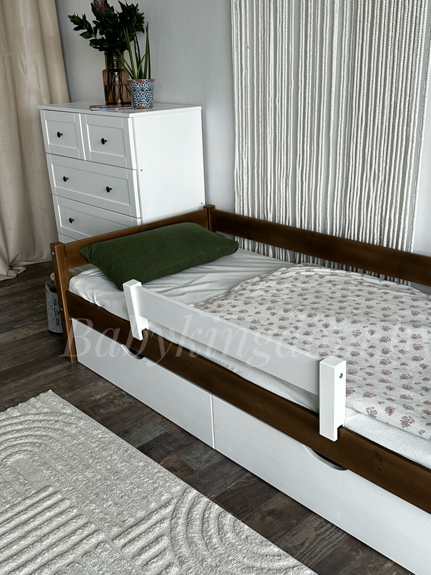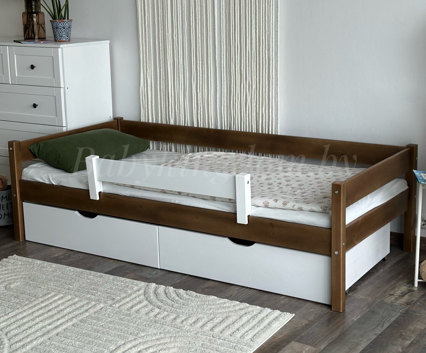 Кровать выполнена из массива сосны и окрашена водоэмульсионной краской,так что вы можете быть спокойны за безопасность вашего ребенка.