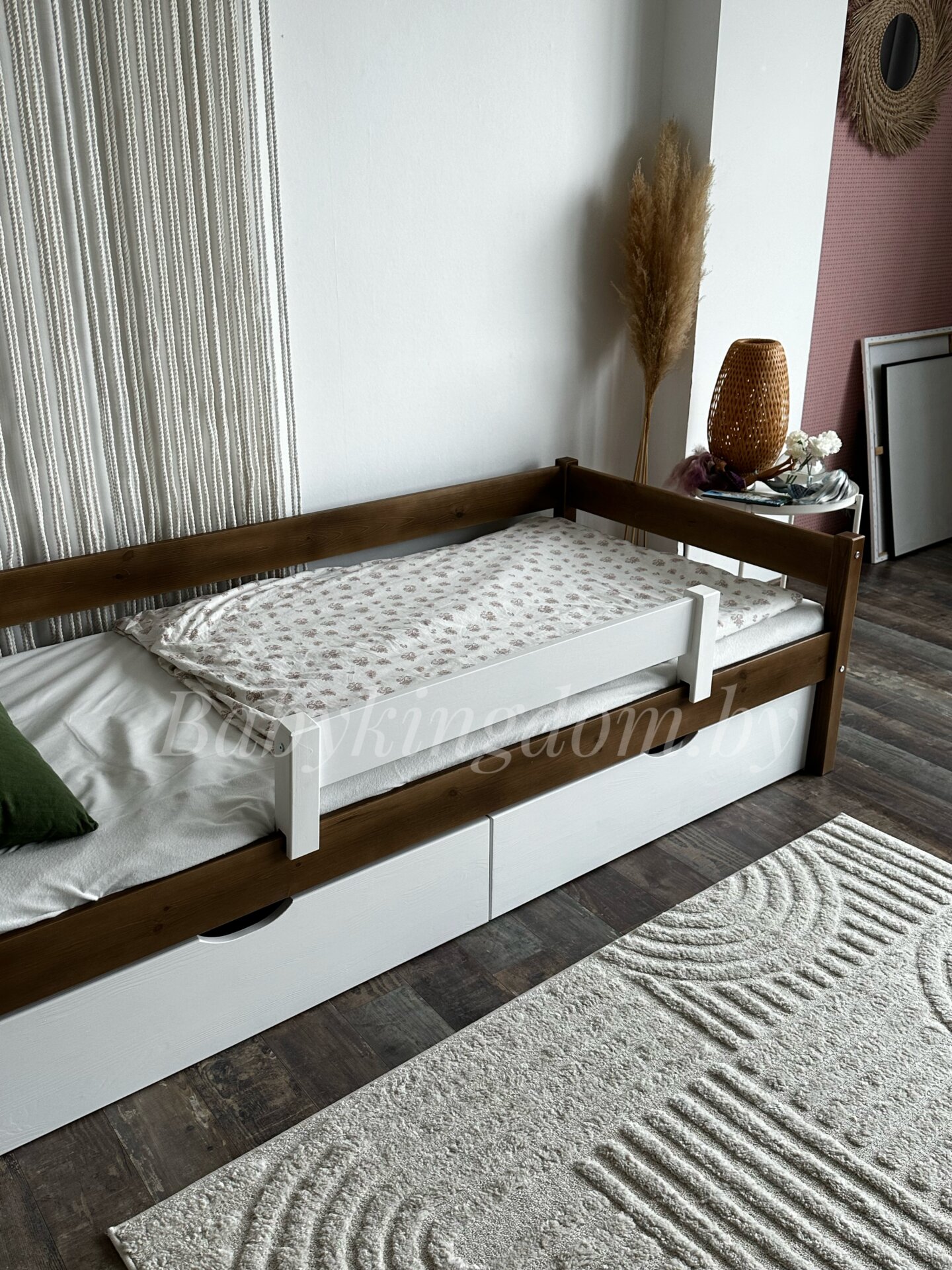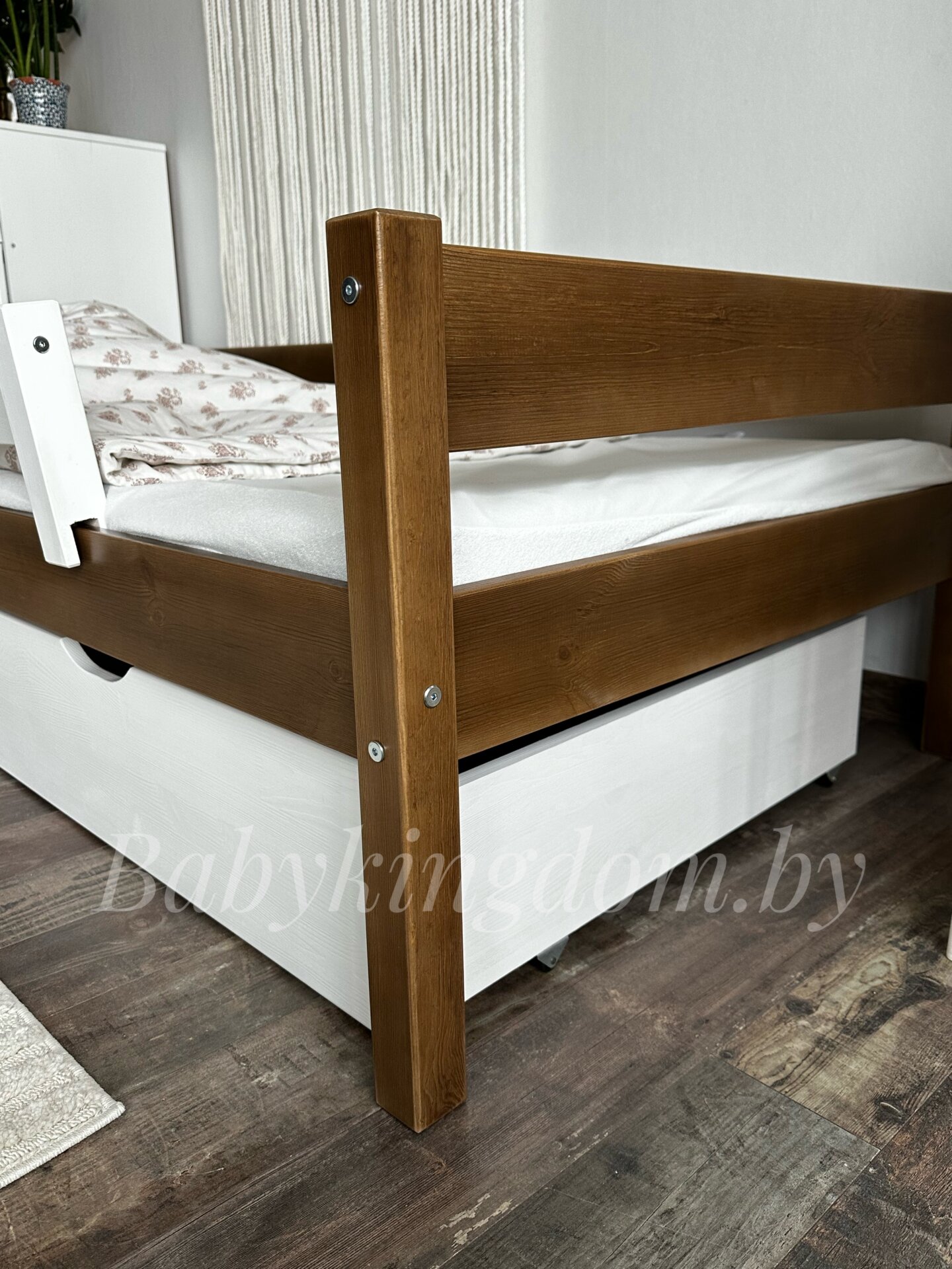 Односпальная кровать из массива сосны «Робби» с ящиками+борт (антик+белый)