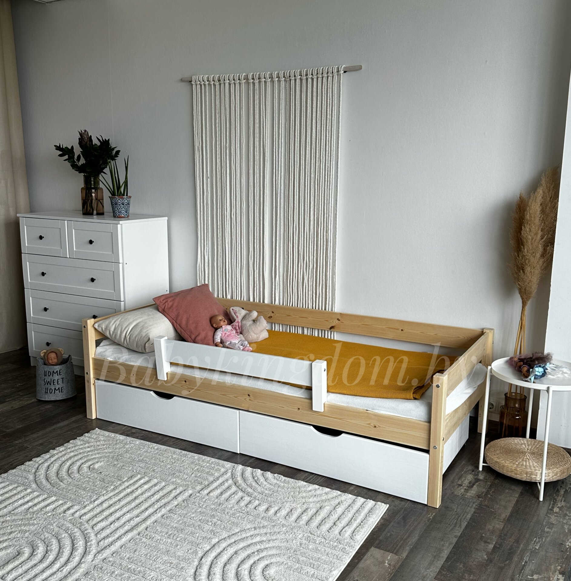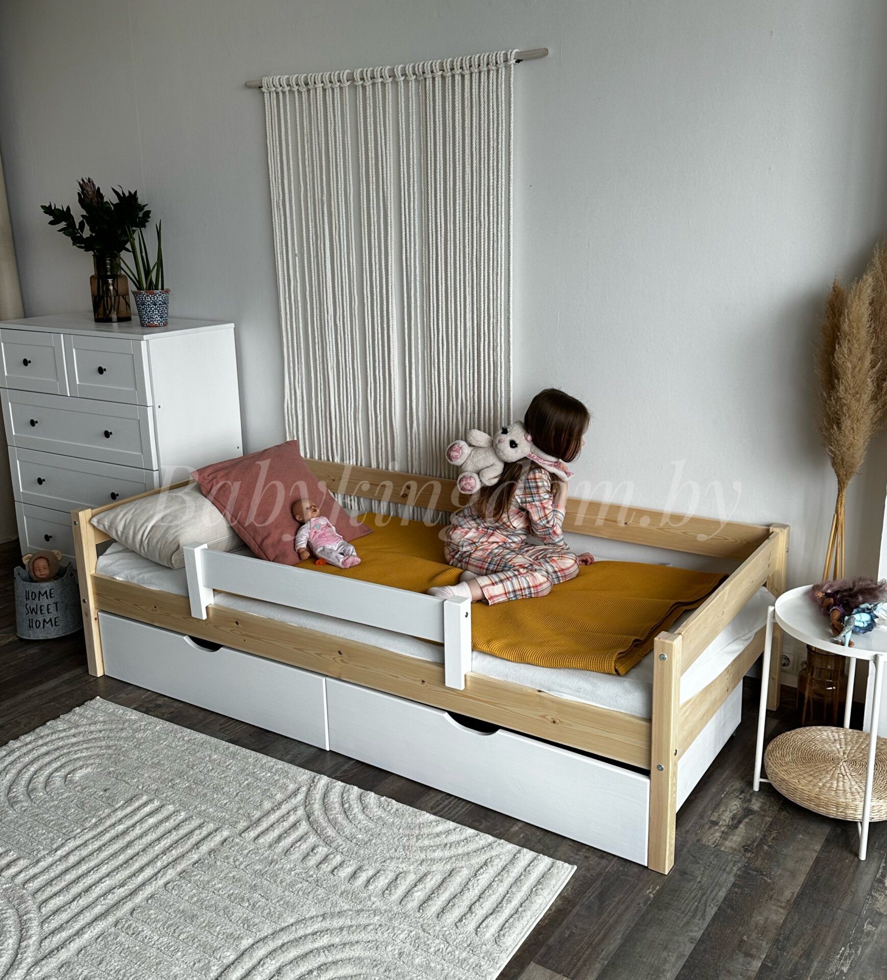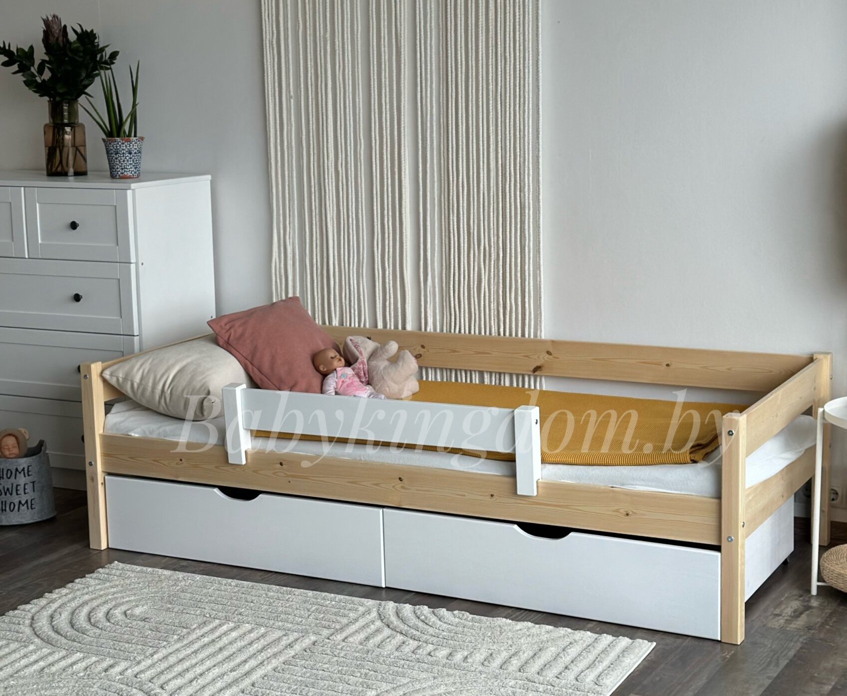 Односпальная кровать из массива сосны «Робби» с ящиками+борт (лак+белый)