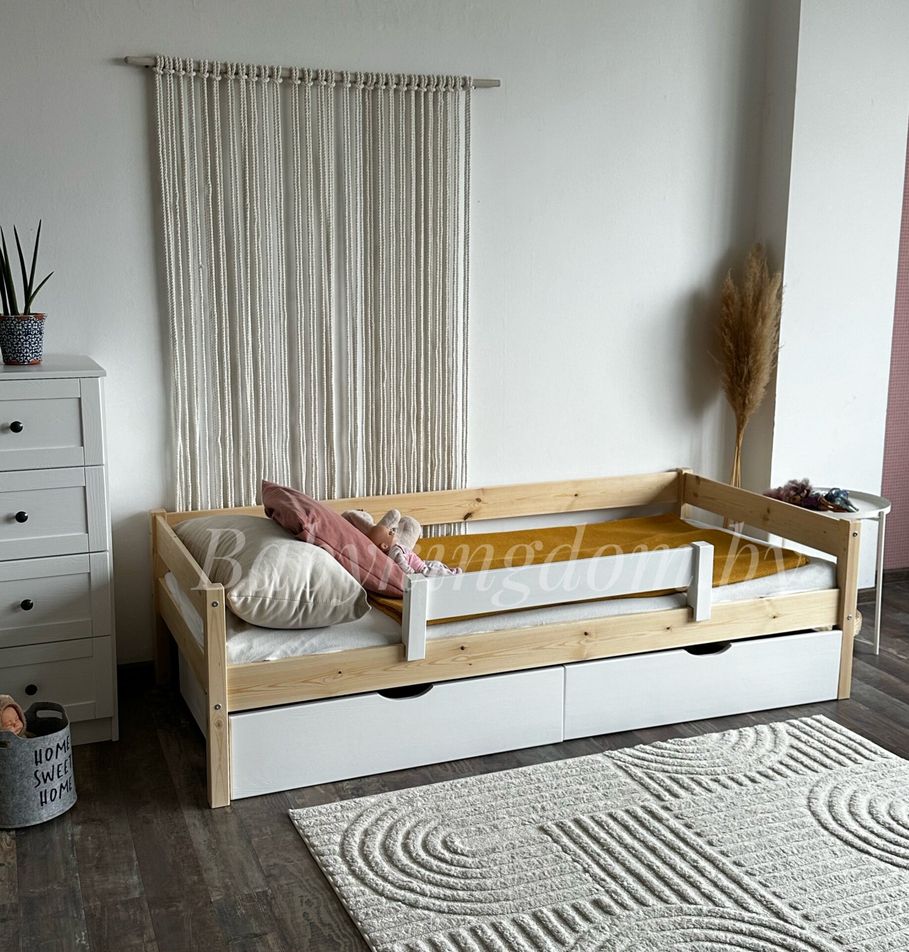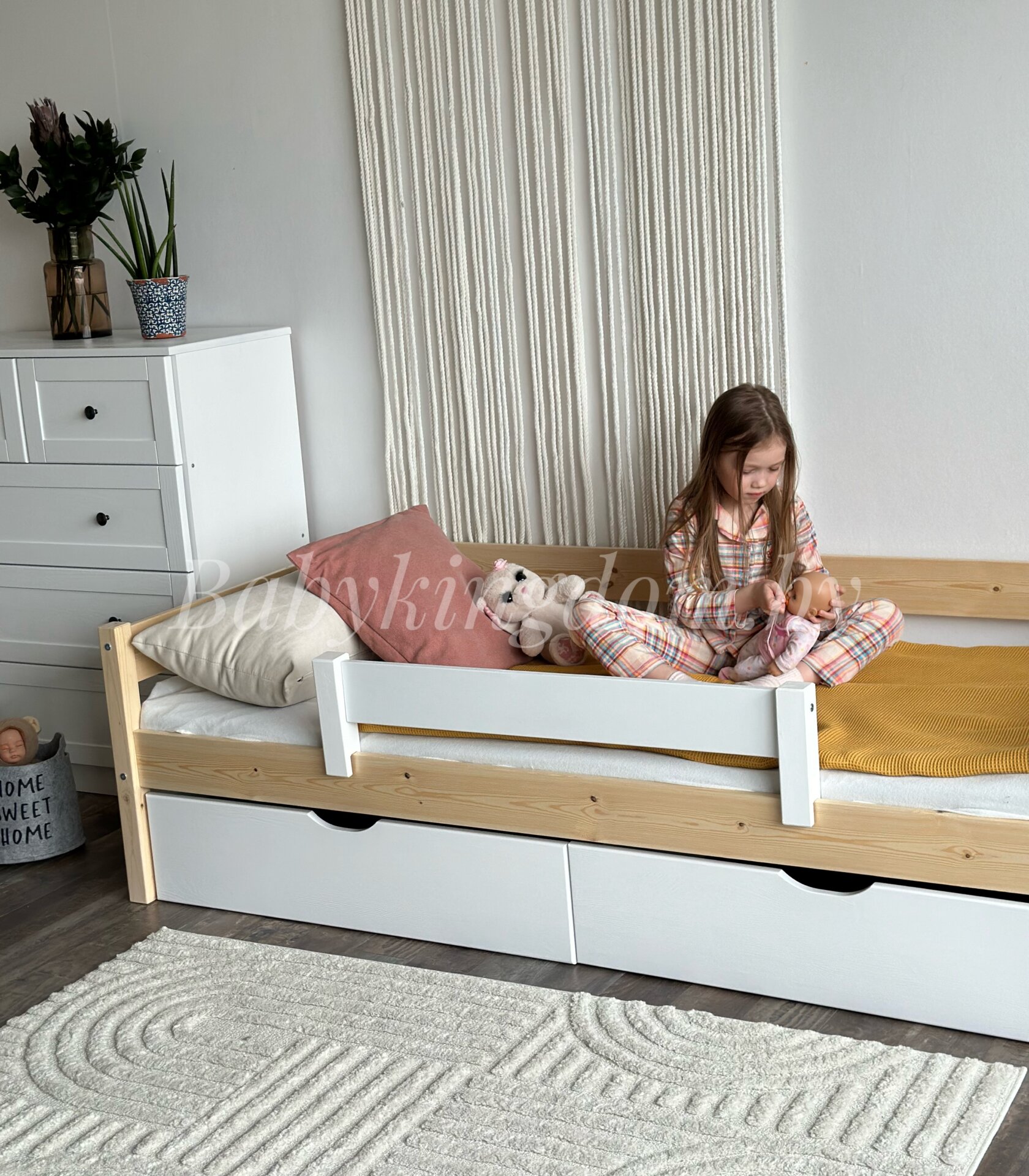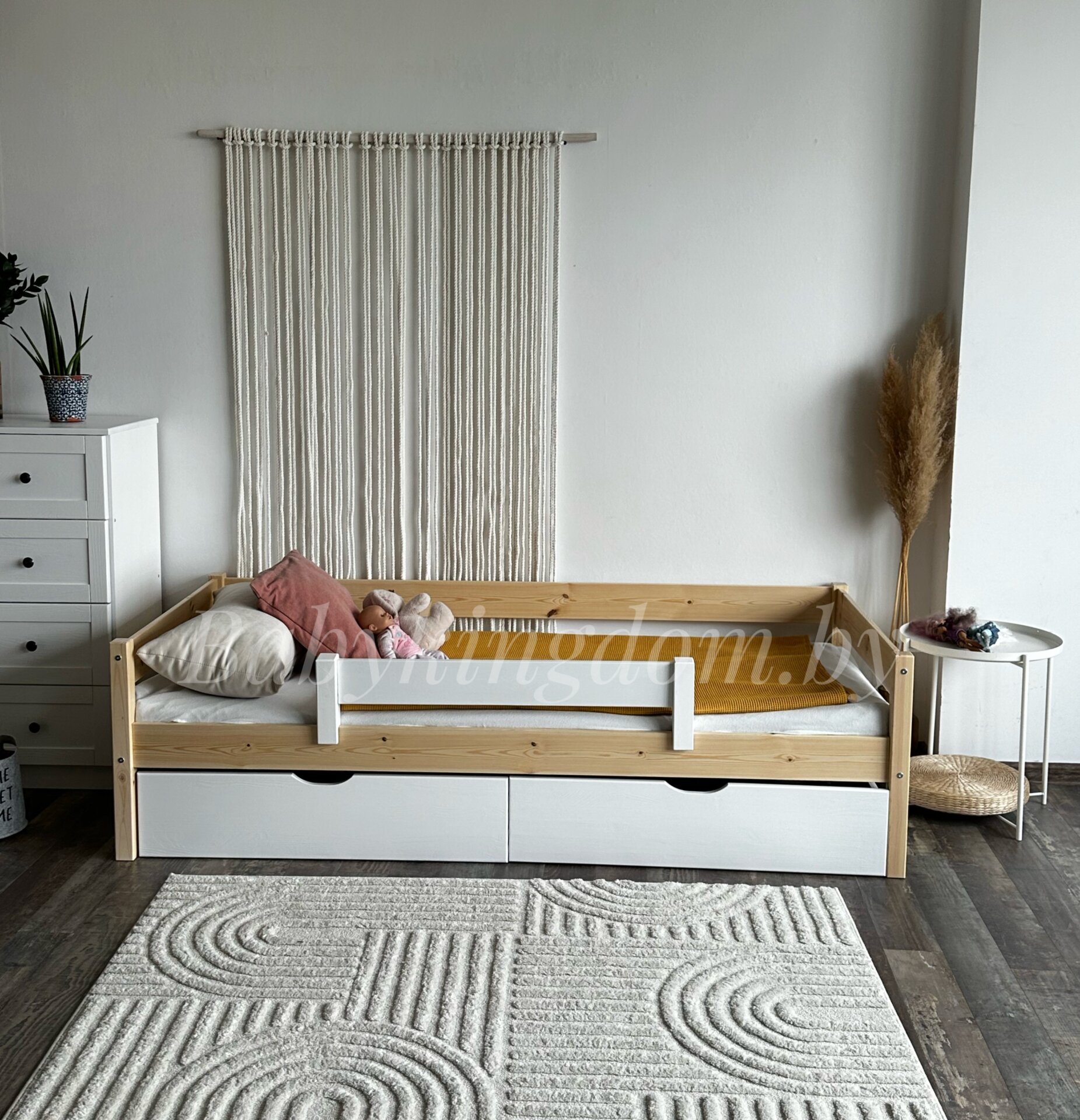 Односпальная кровать из массива сосны «Робби» с ящиками+борт (лак+белый)
