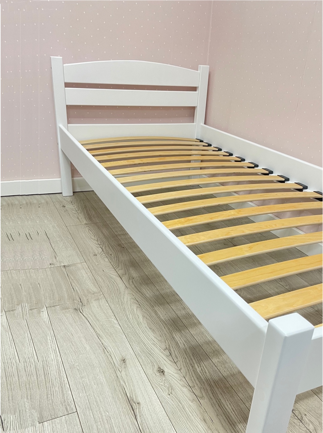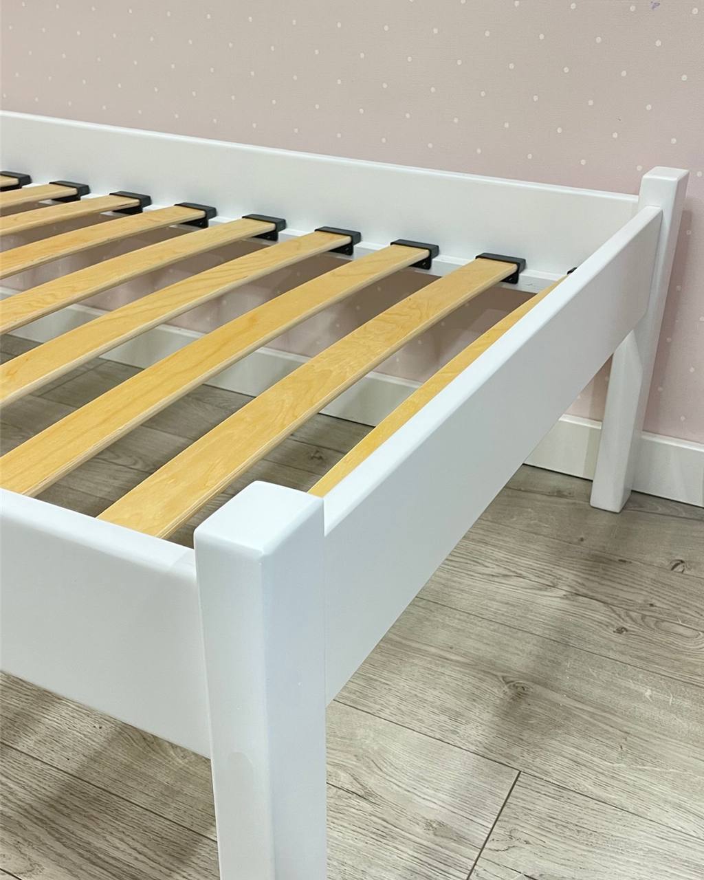 Надежная и мощная кровать из березовой фанеры ,окрашенная в белый цвет полиуретановой краской.