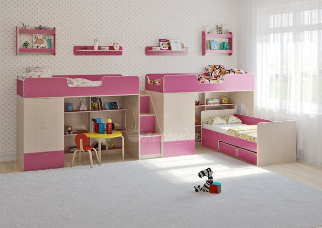 - Между кроватями удобно расположилась угловая лестница ЛУ-11 из трех ступенек. Лестница одновременно выполняет функцию стеллажа.В комплект входят фасады,таким образом получаются полноценные полки с дверками как дополнительное место для хранения.