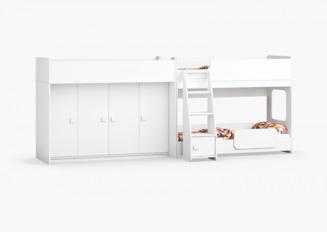 - Две кровати, огромный шкаф для хранения вещей – одна лестница. Идеальный вариант для троих!