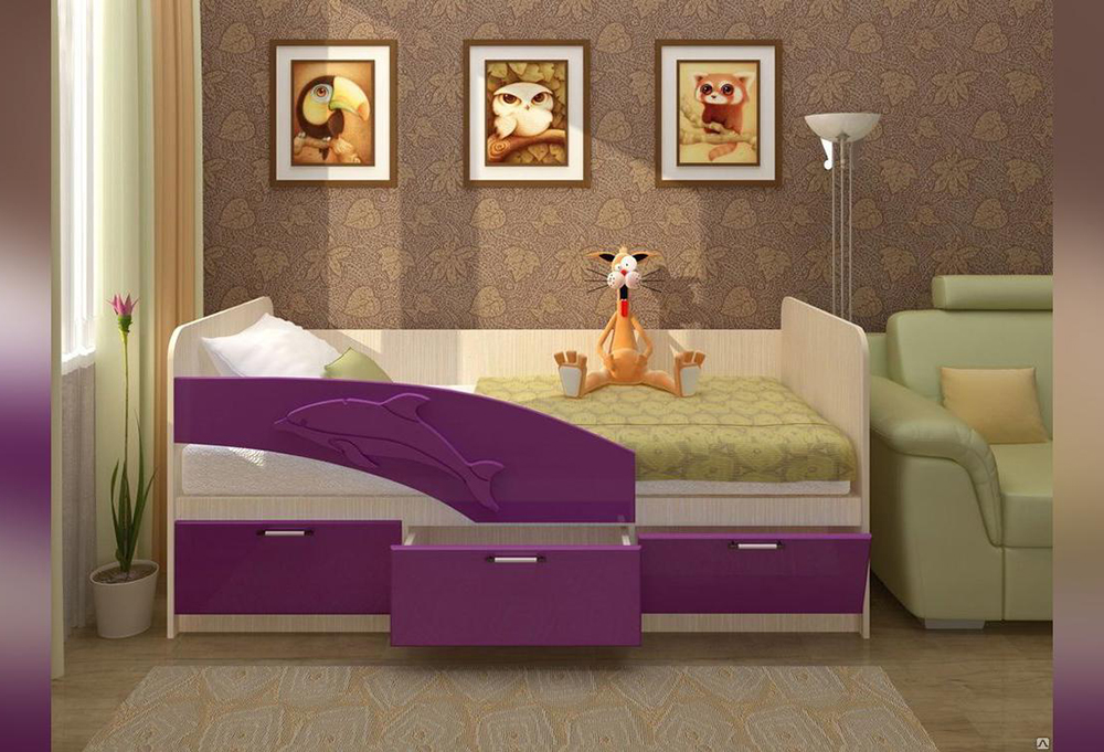 Под кроватью имеются ящики для хранения. Борт со вставкой в виде дельфина цвета фуксии.
