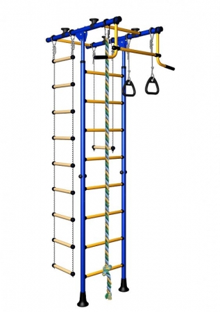 Детский спортивный комплекс «Комета-1» порадует покупателя небольшими габаритами и высокой функциональностью. Стенка включает в себя саму шведскую стенку, стационарный турник, канат, гимнастические кольца, трапецию и веревочную лестницу. Конструкция надежно крепится в распор между полом и потолком и абсолютно безопасна для детей.