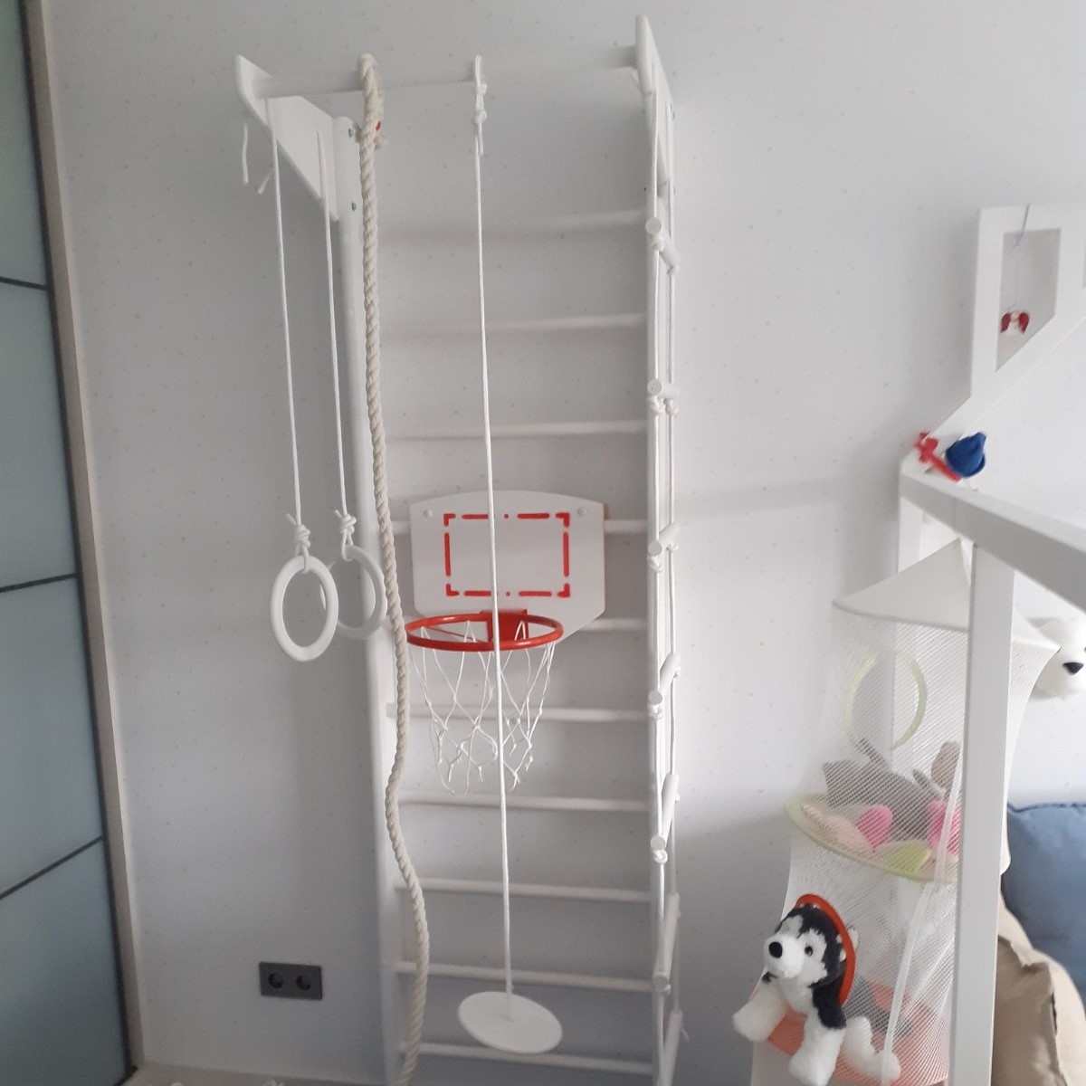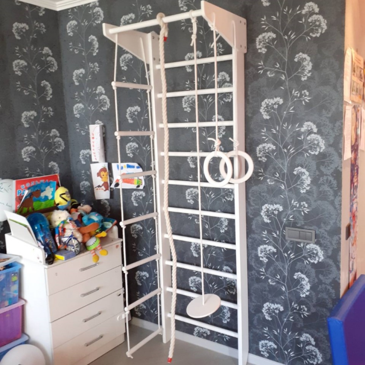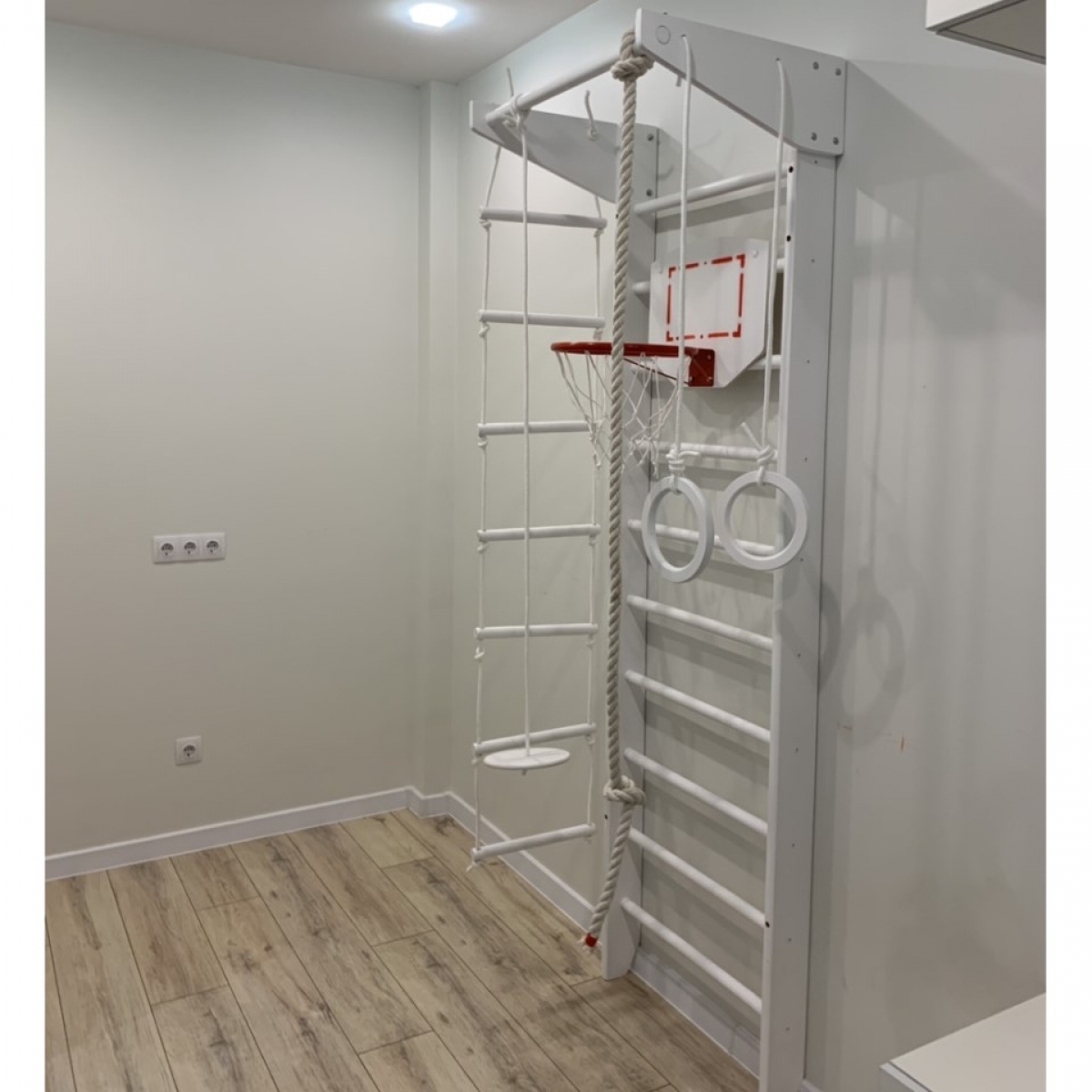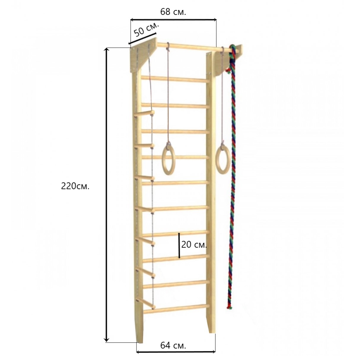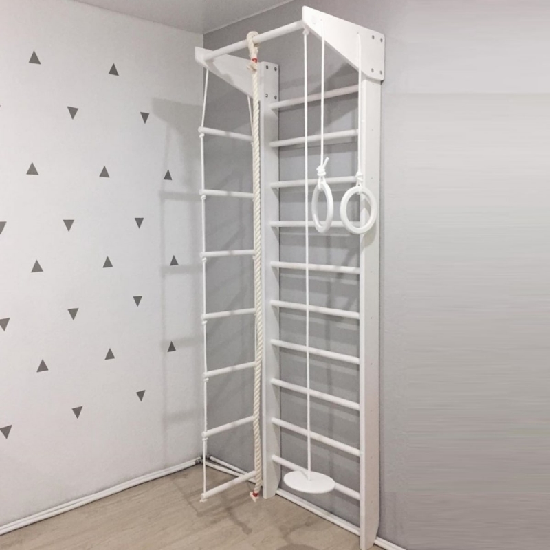 Комплектация: шведская стенка, стационарный турник, гимнастические кольца, веревочная лестница, канат, комплект креплений.
