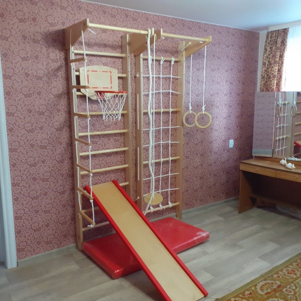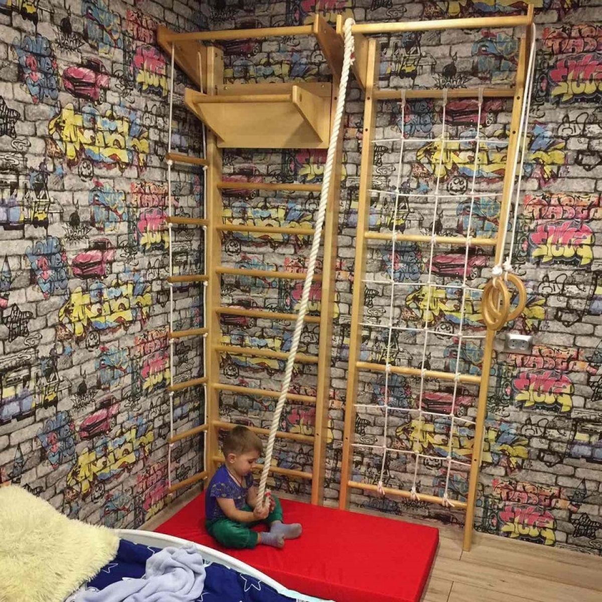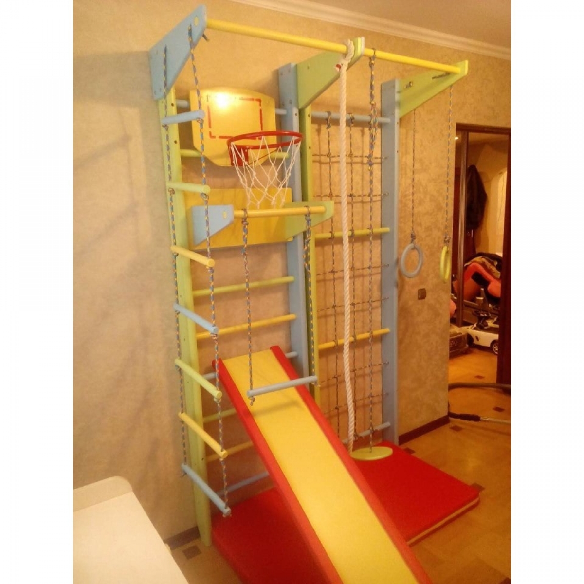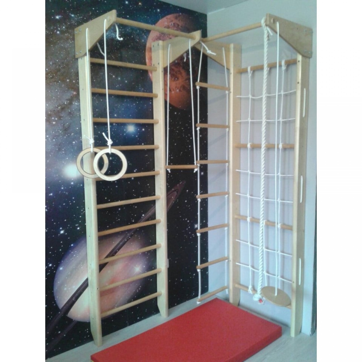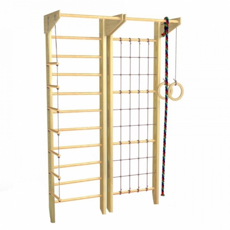 Главная конструктивная особенность данной модели в отличие от аналогичных состоит в возможности использования шведской стенки и гладиаторской сетки по отдельности друг от друга, то есть возможна установка на определённом расстоянии, на разных стенах или в разных комнатах. Тем самым можно оборудовать целый спортивный уголок, где будут заниматься сразу несколько детей и при этом не мешать друг другу. И всё это по очень выгодной цене.