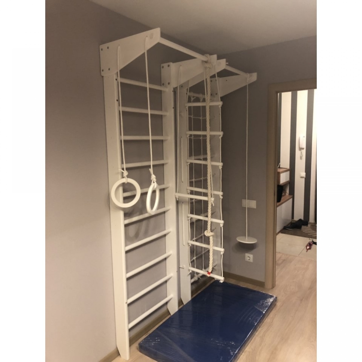 Комплектация: шведская стенка, гладиаторская стенка (сетка), 2 стационарных турника, гимнастические кольца, веревочная лестница, канат, комплект креплений.