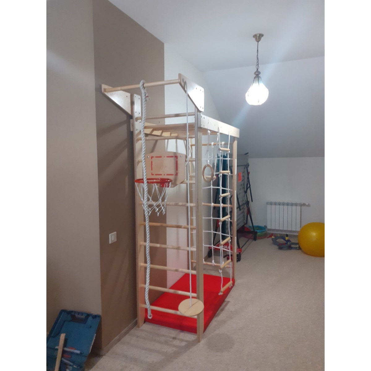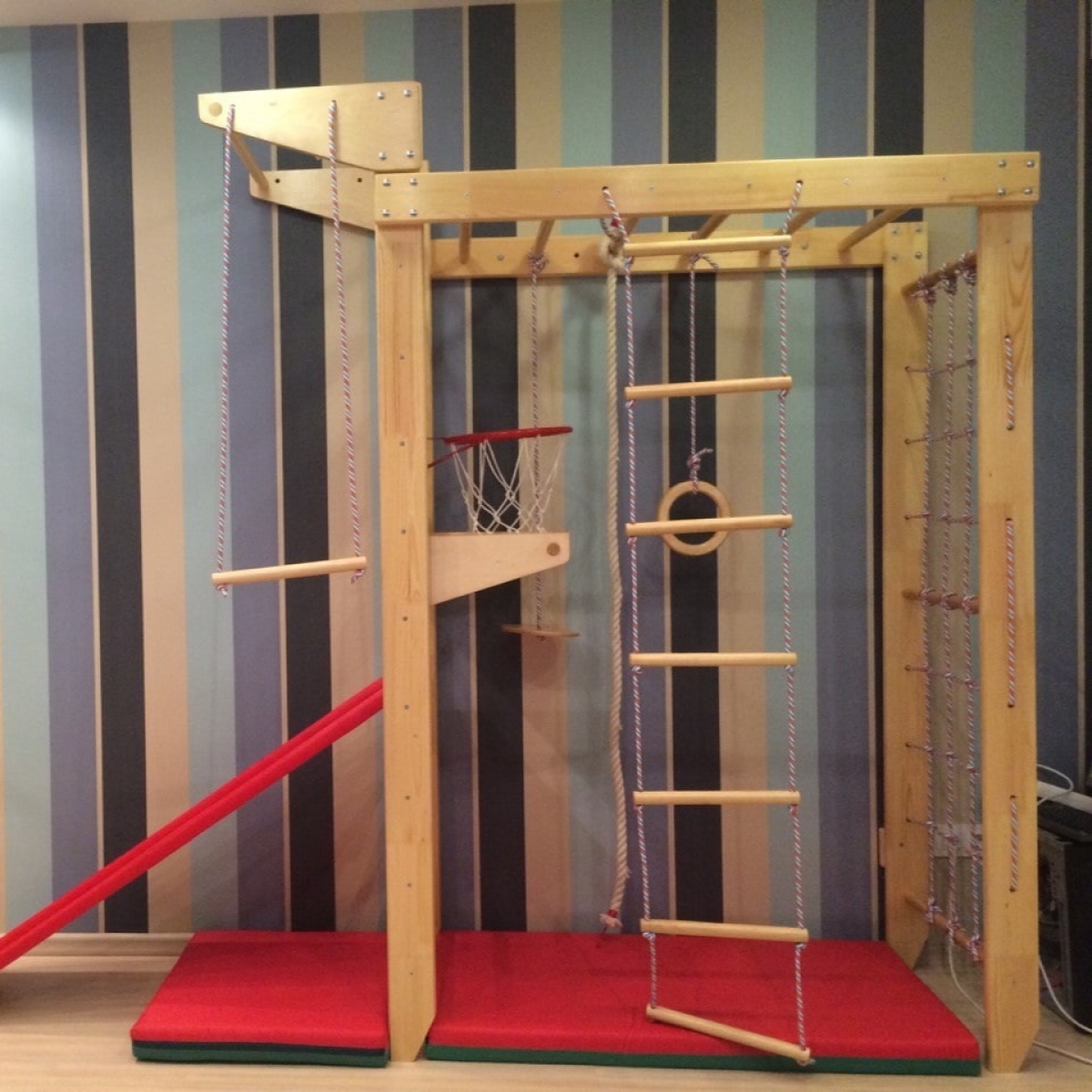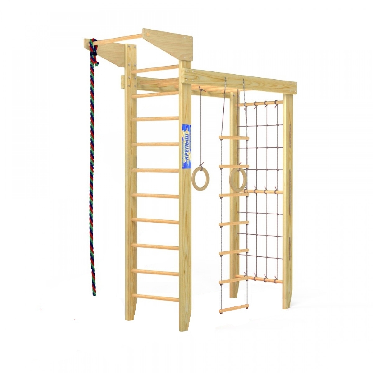 Комплектация: шведская стенка, гладиаторская стенка (сетка), рукоход, стационарный турник, гимнастические кольца, веревочная лестница, канат, комплект креплений.