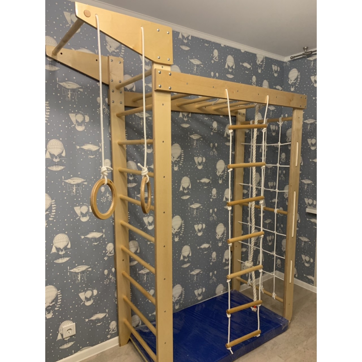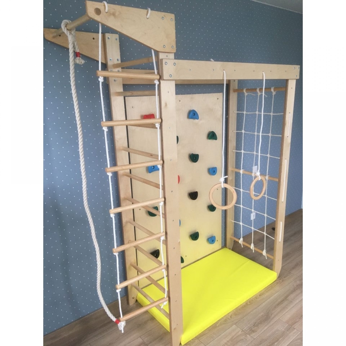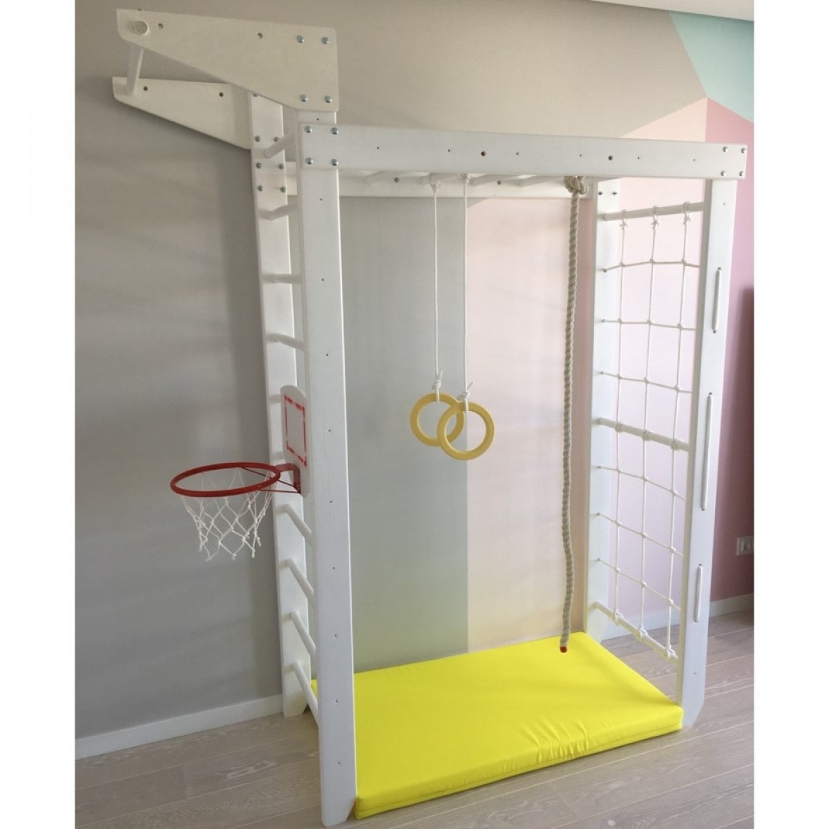 Комплектация: шведская стенка, гладиаторская стенка (сетка), рукоход, стационарный турник, гимнастические кольца, веревочная лестница, канат, комплект креплений.