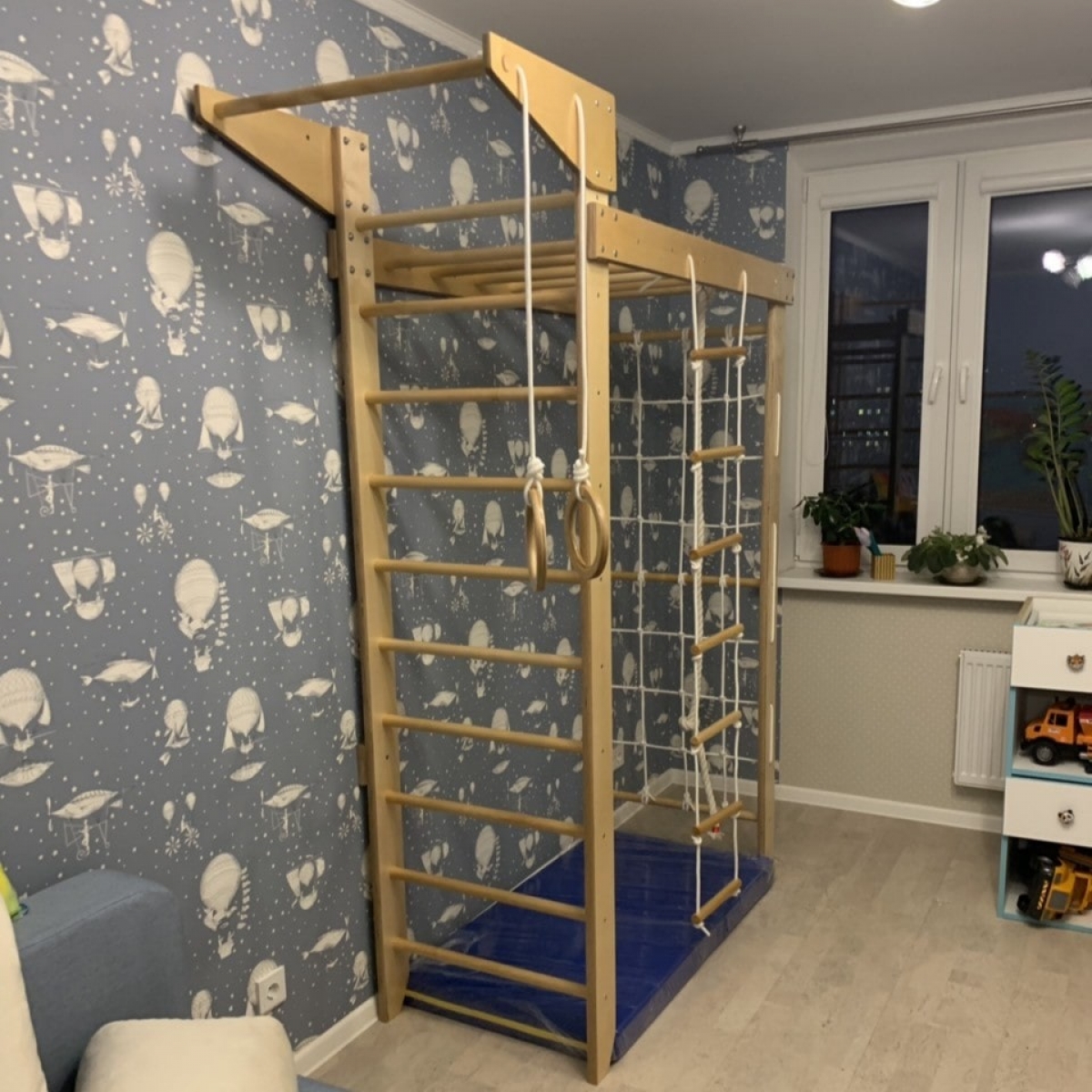 Поставляется заказчикам в собранном виде (шведская стенка, рукоход, гладиаторская сетка), что экономит время на окончательную сборку и установку. Настоятельно рекомендуем использовать спортивный мат, подходящий по размеру для ДСК Крепыш 02.