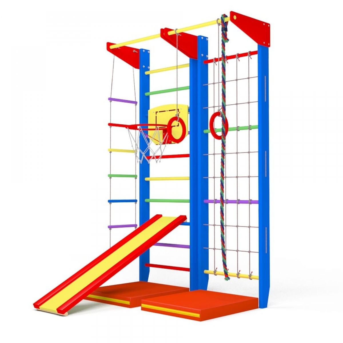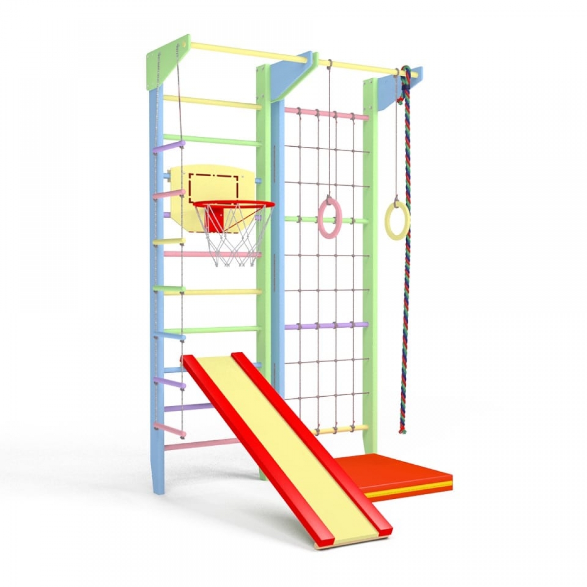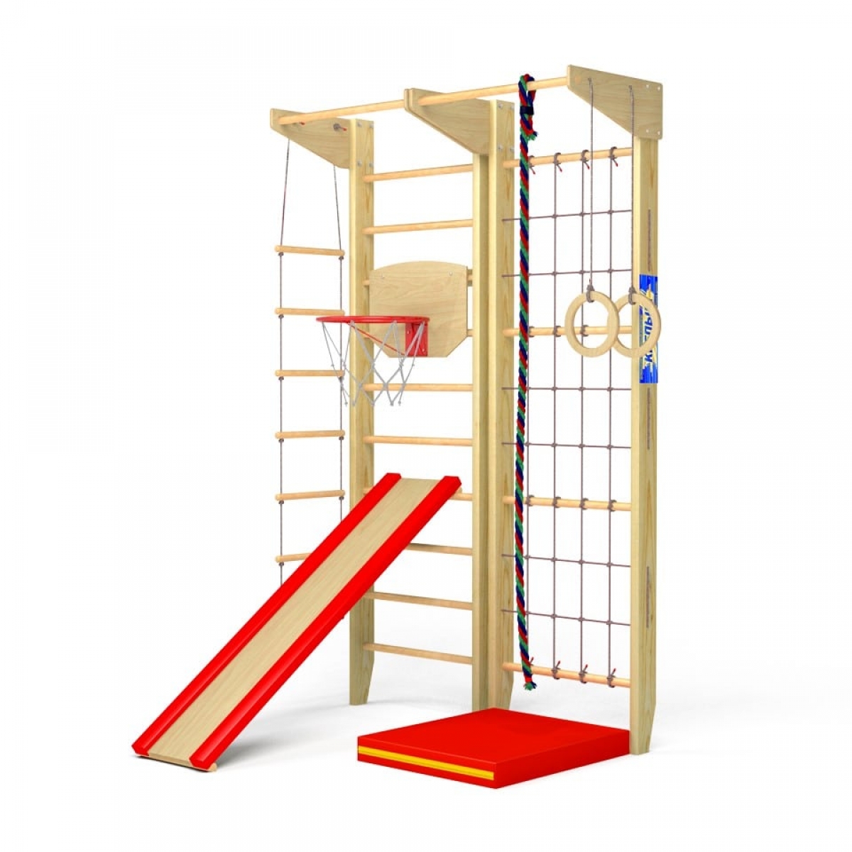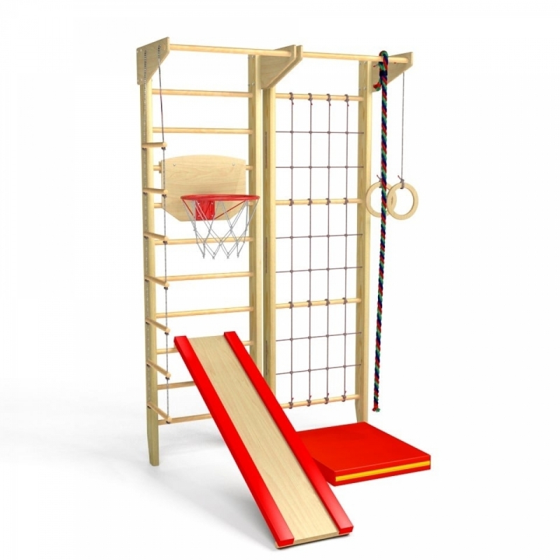 Комплектация: шведская стенка, гладиаторская стенка (сетка), 2 стационарных турника, гимнастические кольца, веревочная лестница, канат, горка, мат 60х70см., баскетбольное кольцо, комплект креплений