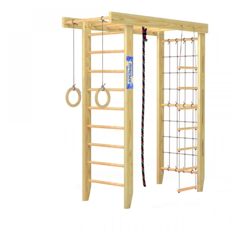 Данная модель состоит из 3 основных элементов: шведская стенка, гладиаторская стенка (сетка), рукоход. За счет данных модулей спортивный комплекс обладает максимальной функциональностью. Наличие стационарного турника на высоте двух метров (за счёт удлинения рукохода) позволяет выполнять специальные упражнения для подтягивания, что раскрывает больший потенциал ваших детей при занятии на ДСК Крепыш.