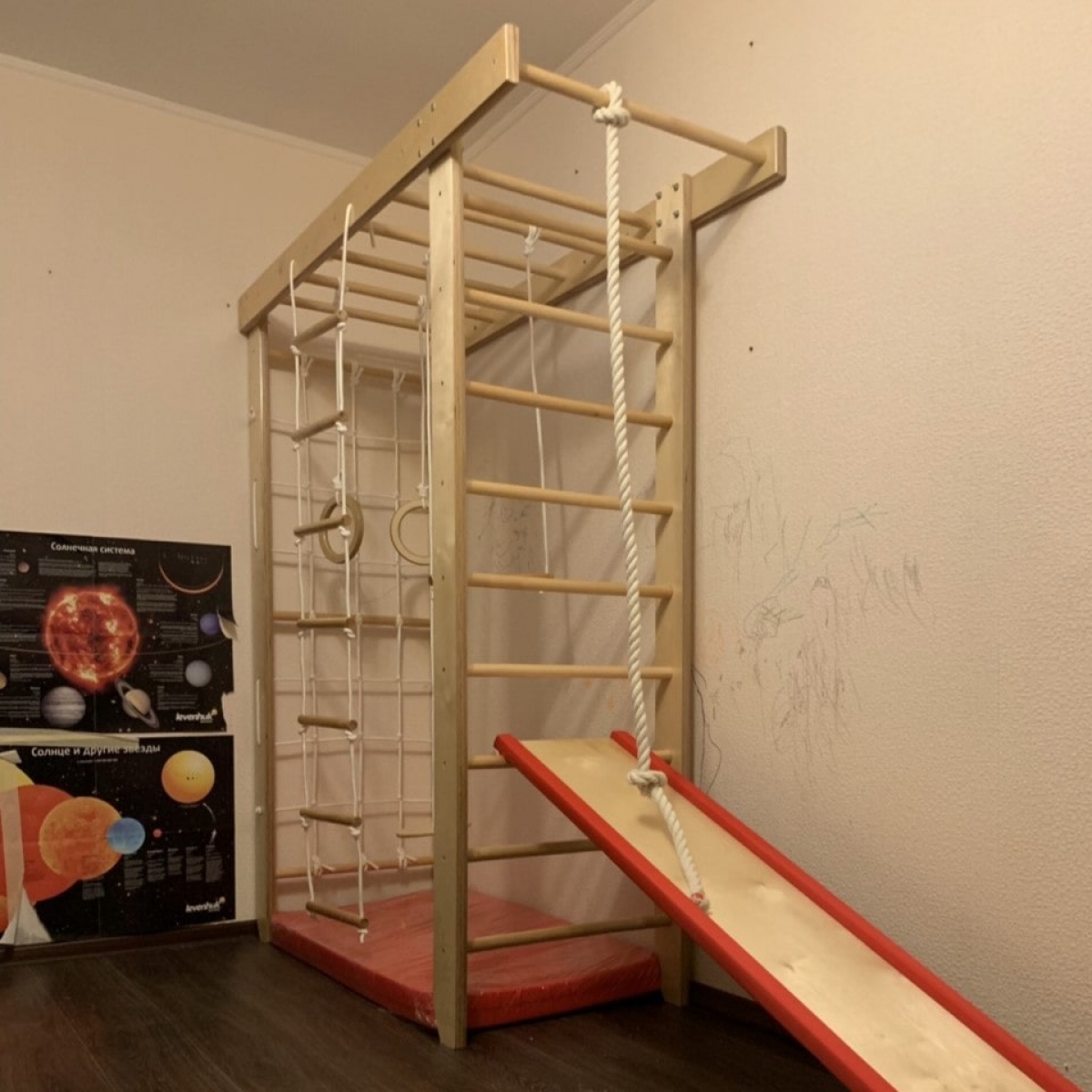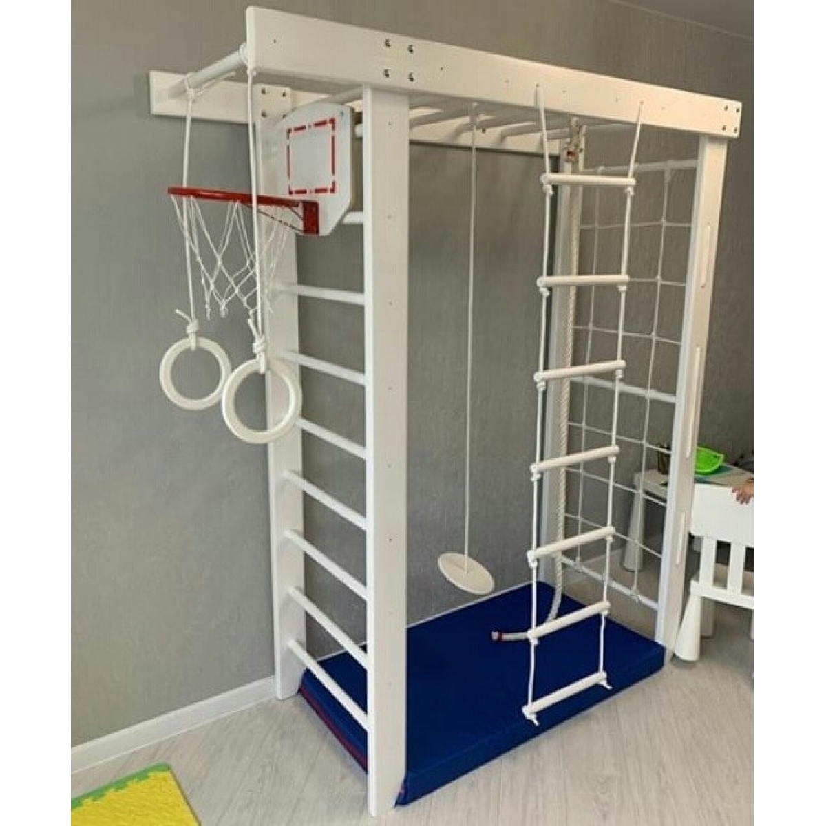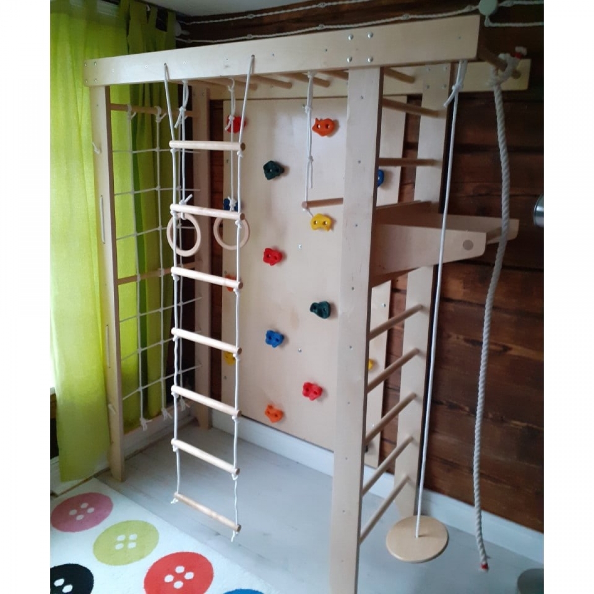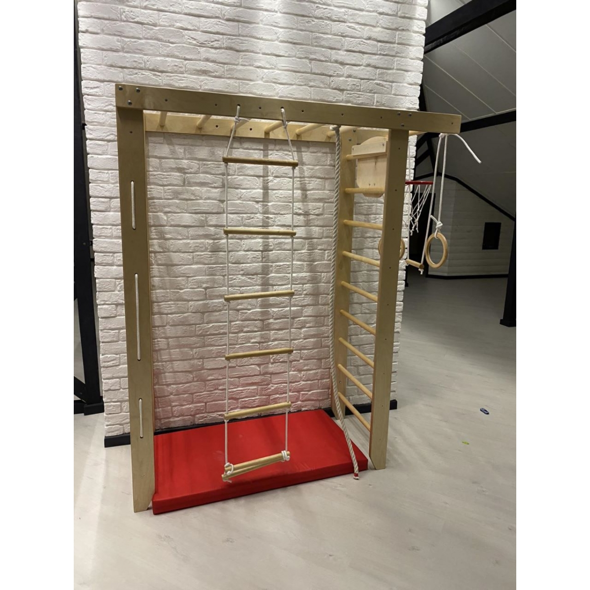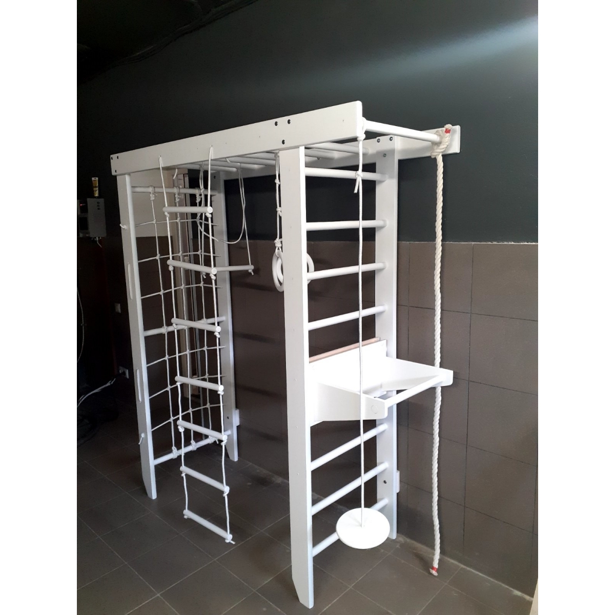 Комплектация: шведская стенка, гладиаторская стенка (сетка), рукоход, гимнастические кольца, веревочная лестница, канат, комплект креплений.