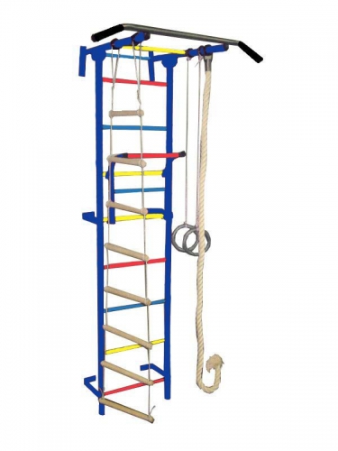 Детский спортивный комплекс «Крепыш плюс» Г-образный выполнен из металла в синем цвете. Конструкция оснащается навесным оборудованием, таким как веревочная лестница, гимнастические кольца и канат. ДСК надежно крепится к стене и достигает в высоту 2200 мм, что оптимально подходит для большинства квартир.