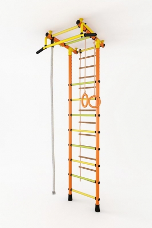 Детский спортивный комплекс «Маугли 01-03М» выполнен в оранжевом цвете. Яркий дизайн с легкостью наполнит динамикой и хорошим настроением интерьер детской комнаты. Комплект состоит из шведской стенки, турника с широким хватом, колец, каната и веревочной лестницы. Данный комплекс может имеет значение максимальной нагрузки 90 кг и может использоваться как детьми, так и взрослыми.