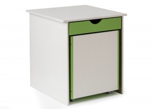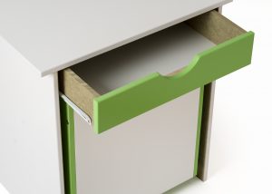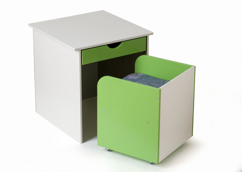 Ящик выдвижной на роликовых направляющих. Подушка паралон и мебельная ткань. Материал — мдф. Покрытие — краска на водной основе. Стульчик на колесиках (прямой ход).