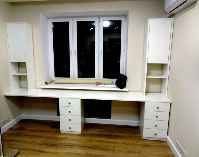 Широкая столешница, тумбы с выдвижными ящиками, шкафчик с полками.